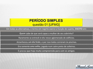 Este documento contém 9 questões sobre período simples com termos sublinhados em cada questão. As questões pedem para classificar os termos sublinhados de acordo com sua função sintática no período, como sujeito, objeto, adjunto etc. O documento fornece as respostas detalhadas para cada questão, explicando a classificação dada a cada termo.