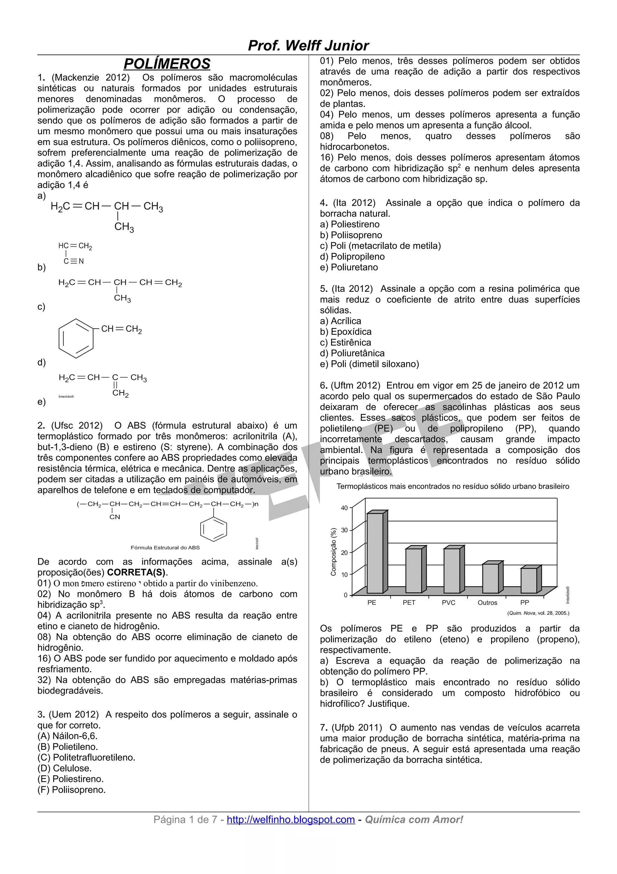 O documento discute polímeros, incluindo suas propriedades e obtenção. Pelo menos três polímeros podem ser obtidos por adição de monômeros, dois podem ser extraídos de plantas, e um apresenta função amida enquanto outro apresenta função álcool. Quatro são hidrocarbonetos e dois têm carbonos sp2.