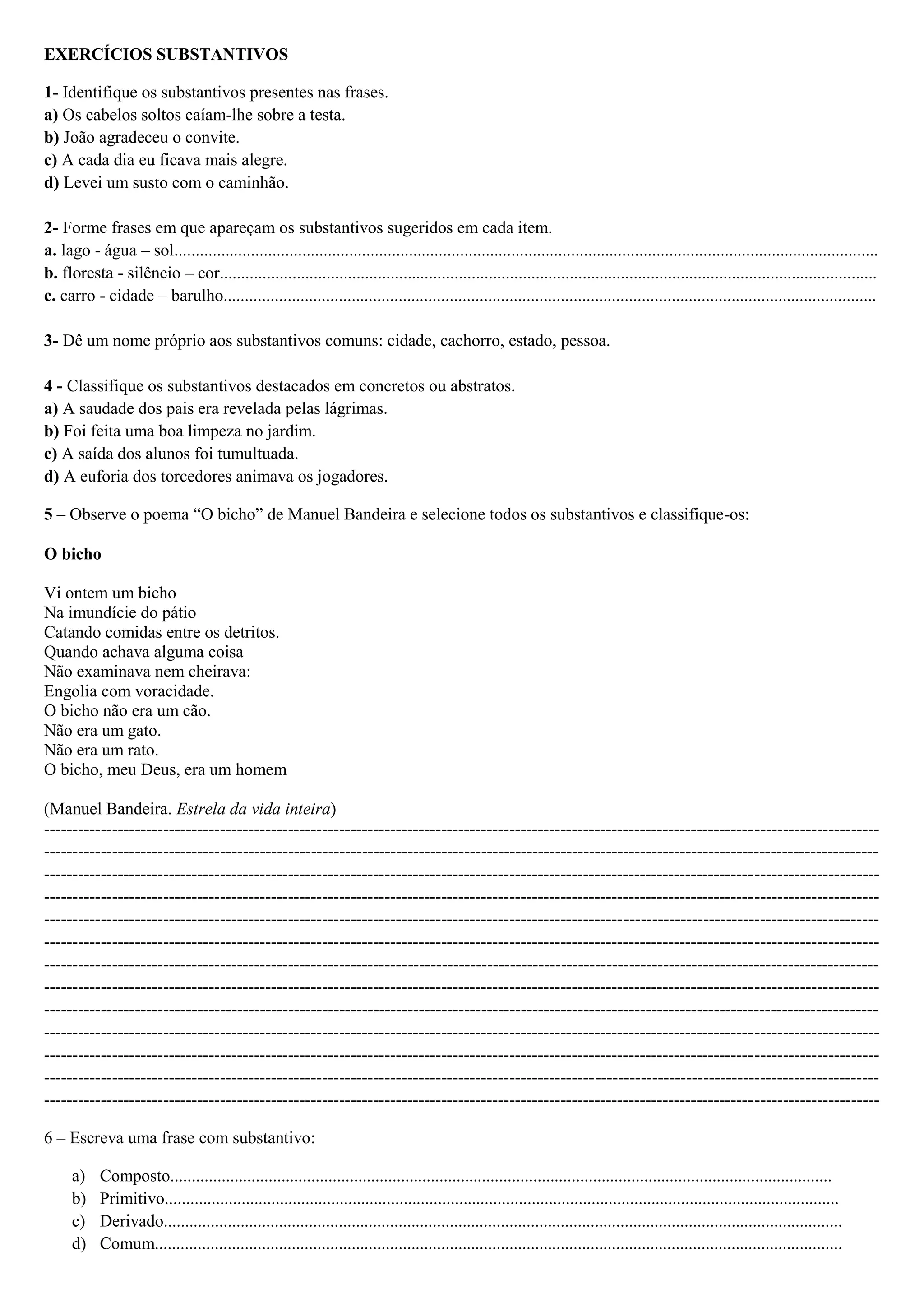 Este documento apresenta exercícios para identificar e classificar substantivos em português. Os alunos devem identificar substantivos em frases, formar novas frases com substantivos dados, nomear substantivos comuns, classificar substantivos como concretos ou abstratos e escrever frases com diferentes tipos de substantivos.