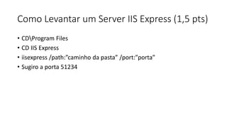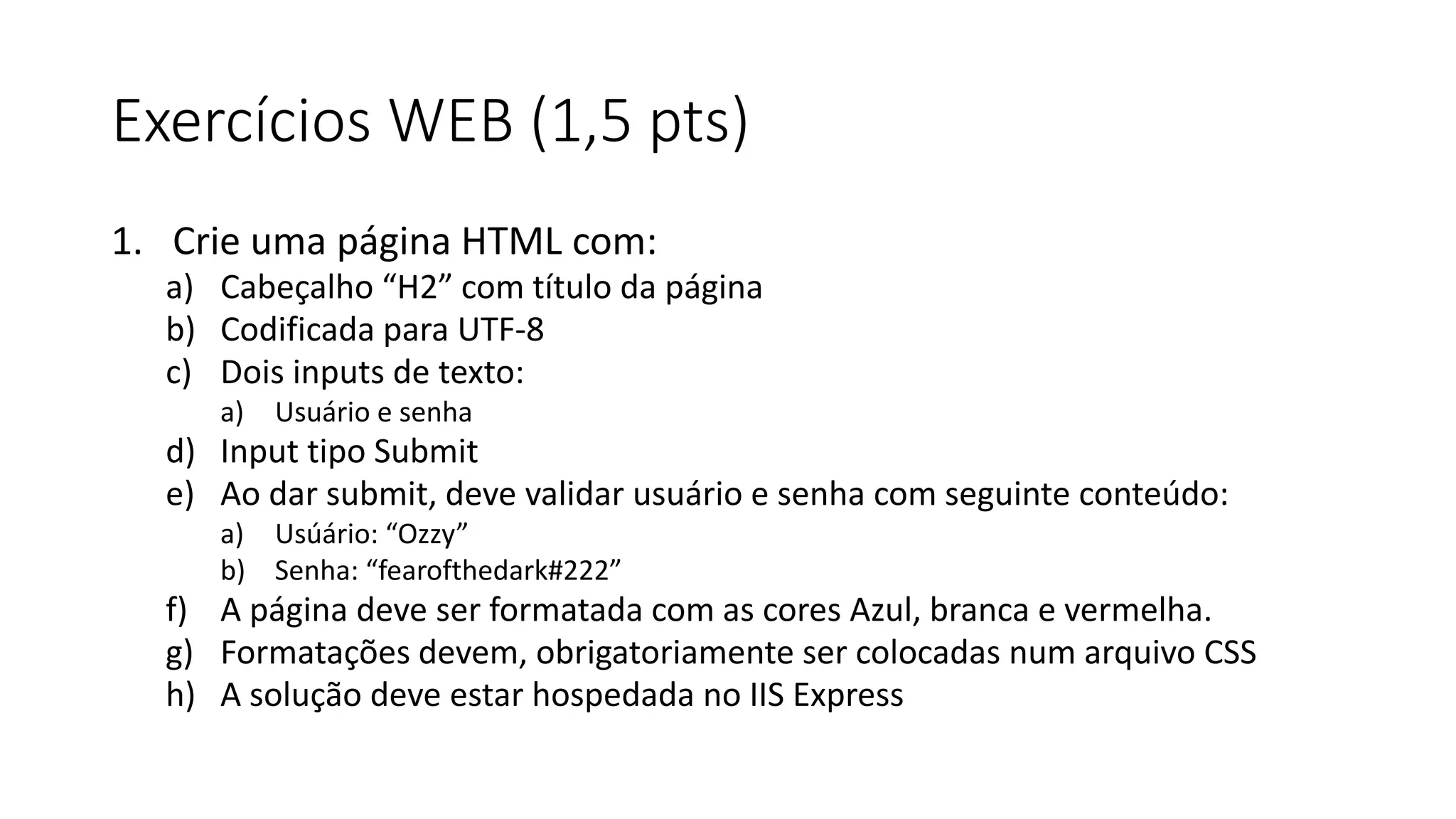 O documento apresenta 4 exercícios: 1) criar uma página HTML com formulário de login validando usuário e senha; 2) explicar como levantar um servidor IIS Express; 3) explicar AJAX e JQuery e fazer uma chamada GET; 4) explicar MVC e frameworks, criando uma lista de músicas editável.