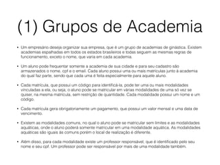 O documento descreve três cenários de modelagem conceitual: um grupo de academias de ginástica, um site de namoro e um condomínio residencial. Cada um apresenta regras específicas sobre cadastros, matrículas, agendamentos de encontros e gestão de apartamentos. As informações incluem detalhes como identificação de alunos, usuários, professores e moradores, além de regras sobre pagamentos e gestão de taxas.