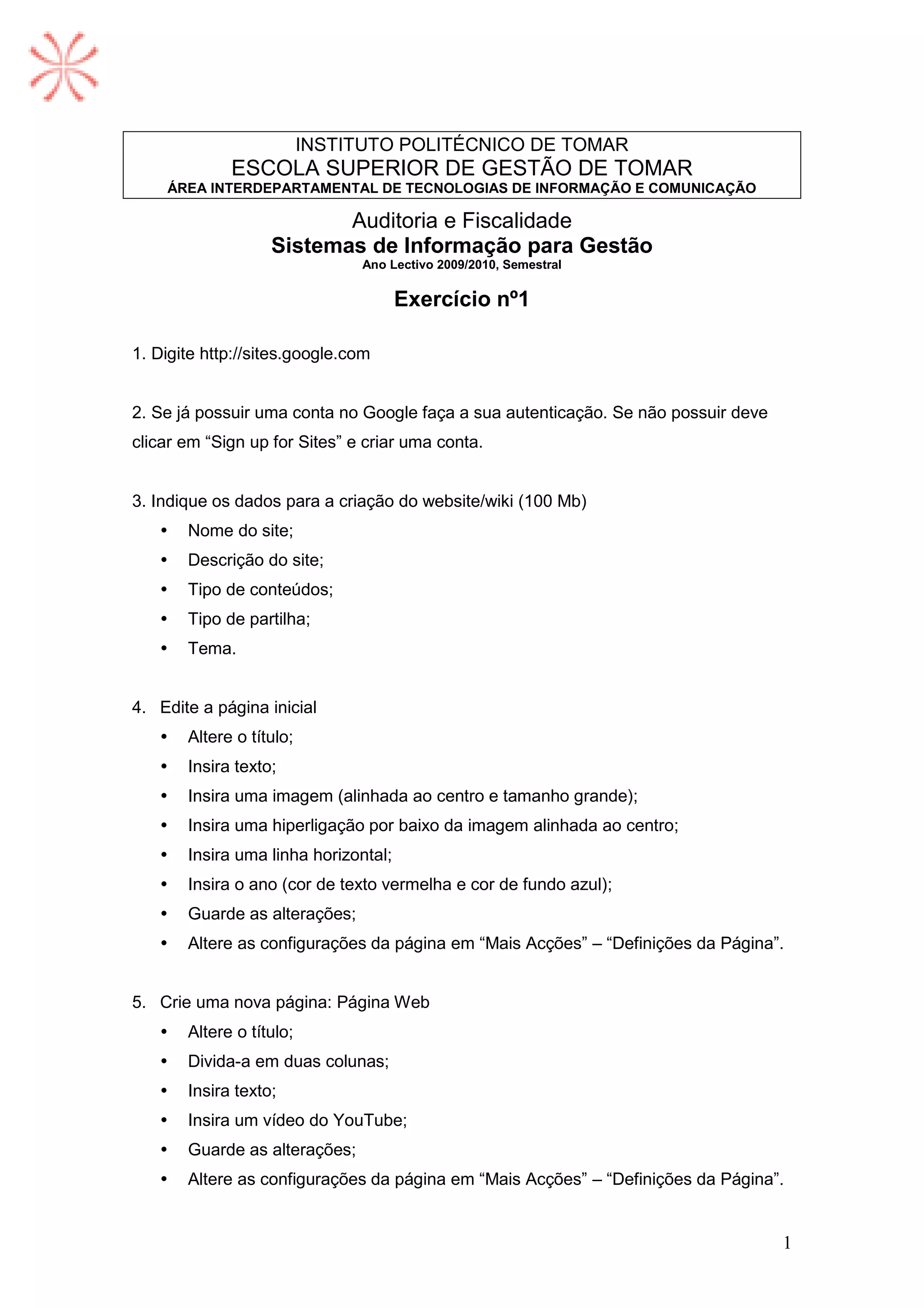 Este documento fornece instruções para criar um site no Google Sites, incluindo adicionar páginas, inserir conteúdo, organizar arquivos, configurar partilha e analíticas. O leitor é instruído a criar várias páginas com diferentes elementos como texto, imagens, vídeos e listas, e personalizar o site com temas, cores e logotipo.