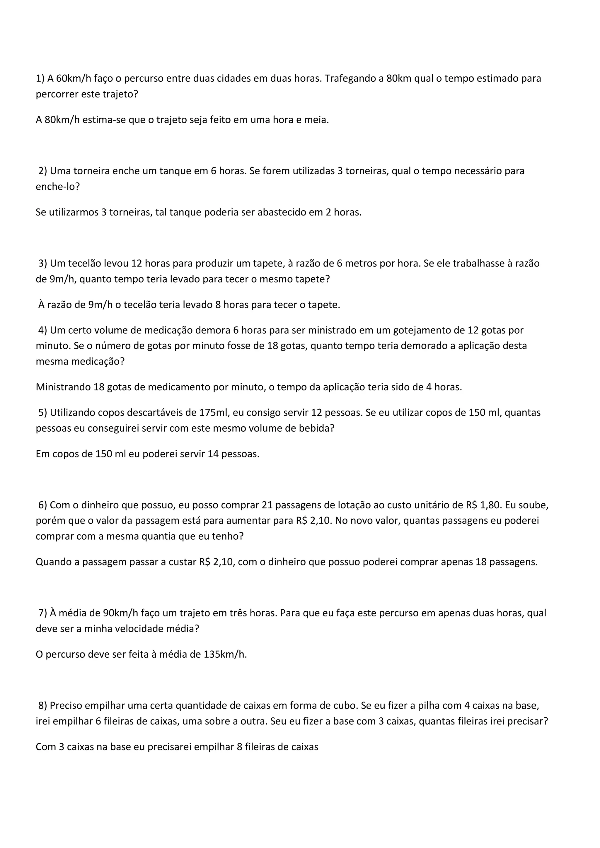 1) O documento contém 8 problemas de raciocínio matemático resolvidos, envolvendo cálculos de velocidade, tempo, volume e quantidades usando proporcionalidade e regra de três.