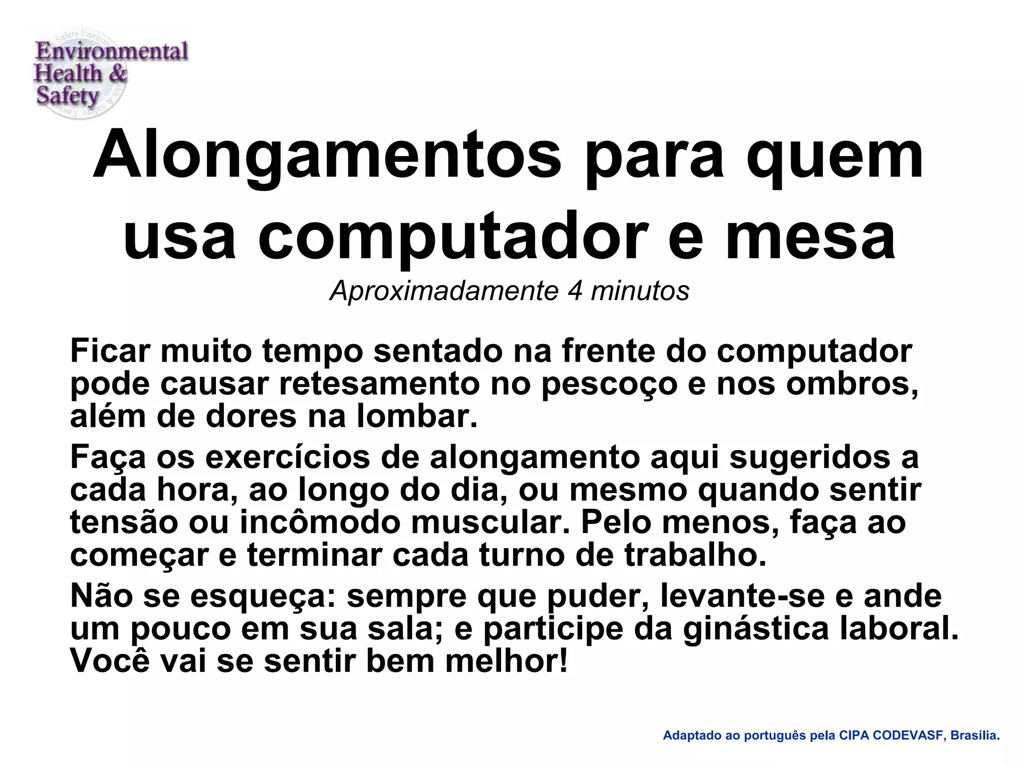 O documento fornece exercícios de alongamento para quem fica muito tempo sentado no trabalho, sugerindo realizá-los a cada hora para aliviar tensão muscular. Os exercícios incluem alongar o pescoço, ombros e costas por 10-20 segundos, alongando os braços por 10-12 segundos e alongando as pernas por 8-10 segundos.