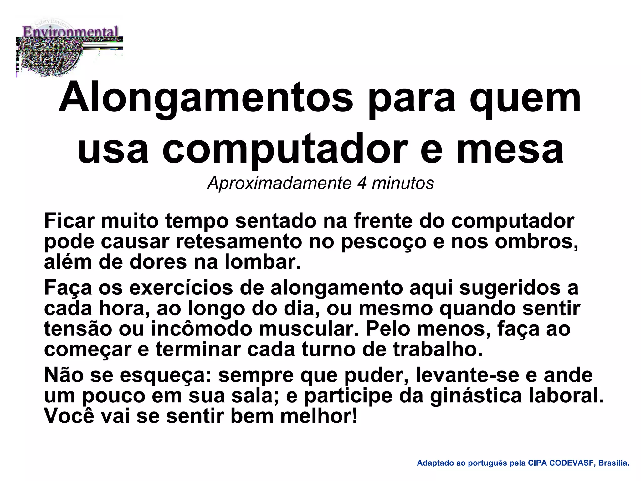 Este documento fornece uma série de exercícios de alongamento para quem passa muito tempo sentado em frente ao computador, com o objetivo de aliviar tensões no pescoço, ombros e lombar. São sugeridos exercícios simples para serem realizados a cada hora, como levantar e andar pela sala, além de participar de atividades de ginástica laboral.