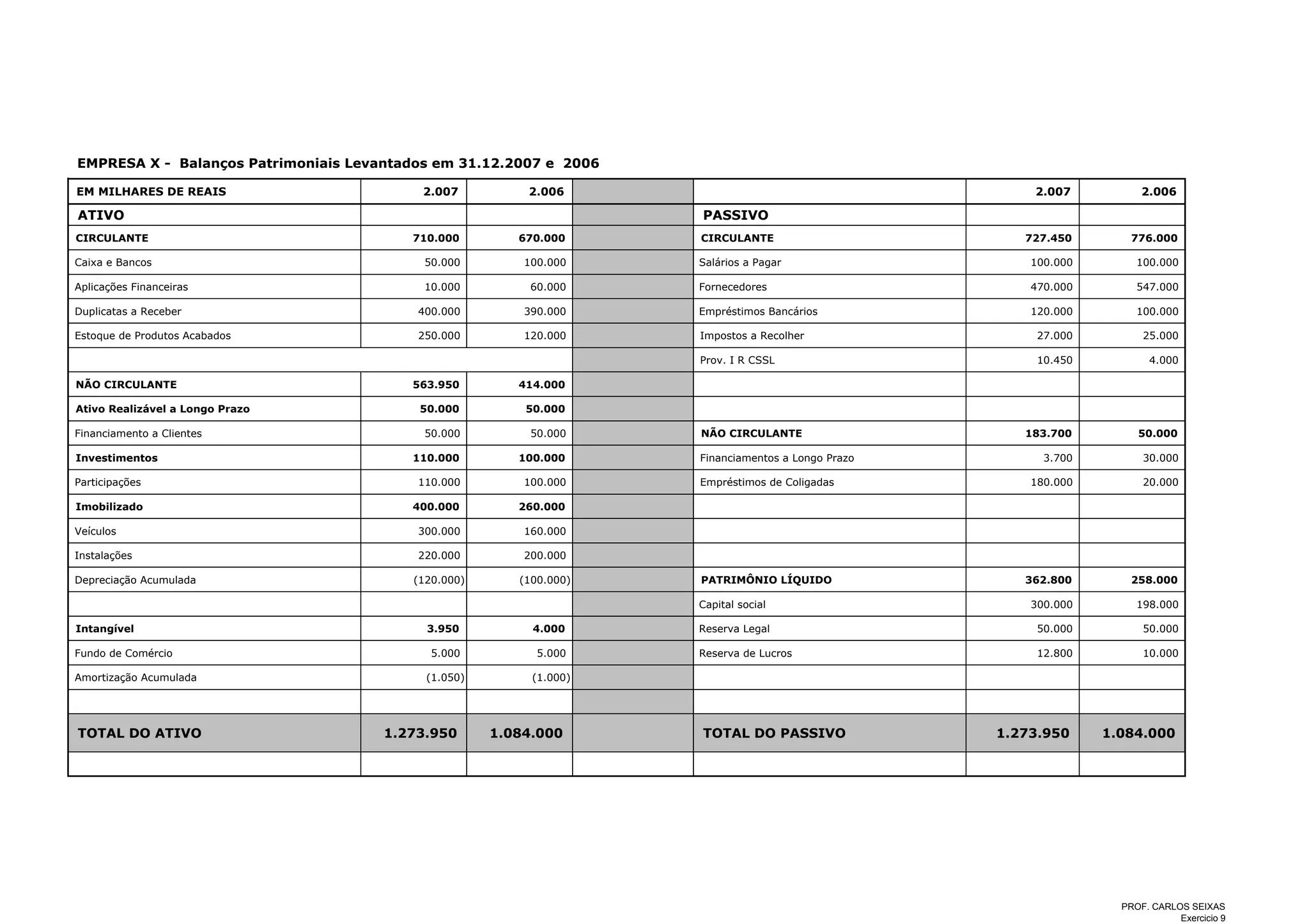 O documento apresenta os balanços patrimoniais da Empresa X em 31 de dezembro de 2007 e 2006, demonstrando um aumento no ativo total de R$189,95 milhões. O patrimônio líquido cresceu R$104,8 milhões no período, impulsionado principalmente pelo aumento no capital social e na reserva de lucros. As aplicações financeiras diminuíram R$50 milhões enquanto o estoque de produtos acabados aumentou R$130 milhões.