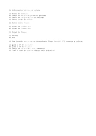 O documento fornece informações sobre uma coleta de dados de rede, incluindo o número total de pacotes, tempos de início e fim da coleta, números de fluxos TCP e UDP. Ele também relata uma invasão FTP, com detalhes como os IPs do atacante e vítima, tempo de início do fluxo e nome do arquivo acessado pelo atacante.