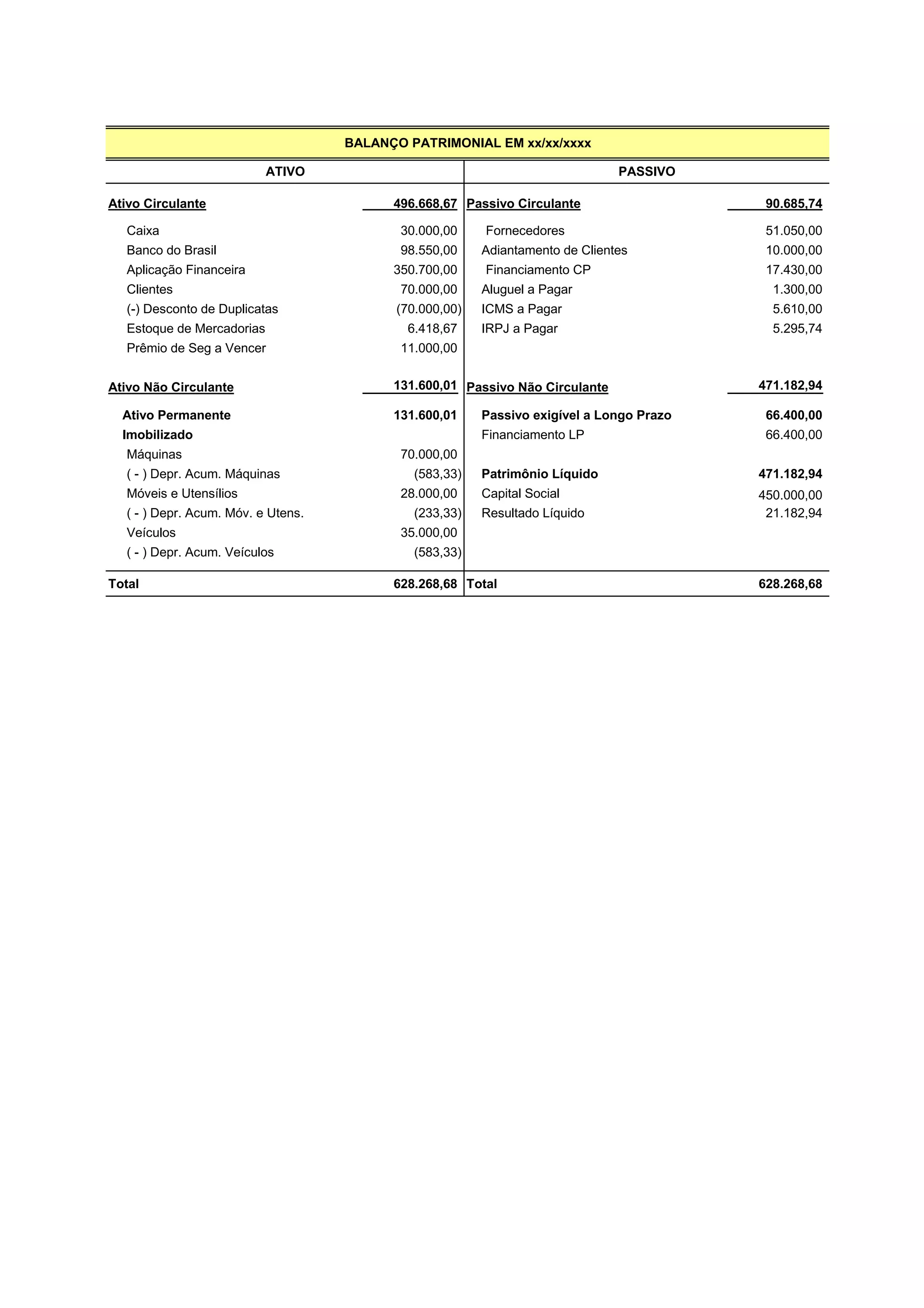 Este balanço patrimonial apresenta a situação financeira de uma empresa em determinada data, mostrando seus ativos (bens e direitos), passivos (dívidas e obrigações) e patrimônio líquido. Entre os ativos, destacam-se aplicações financeiras, clientes e estoque. Nos passivos, os principais itens são fornecedores, financiamentos e impostos a pagar. O patrimônio líquido é composto pelo capital social e resultado acumulado.