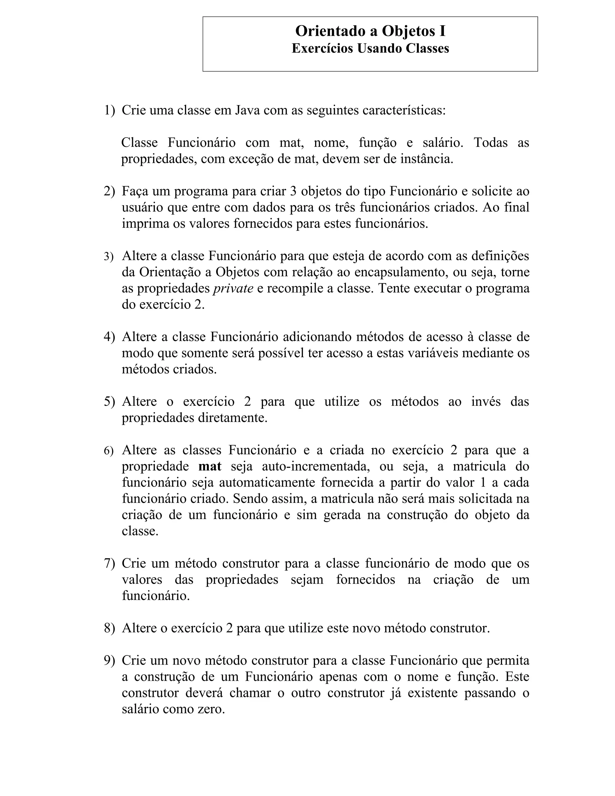 O documento descreve uma série de exercícios para desenvolver uma classe Funcionário em Java com propriedades como matrícula, nome, função e salário. Os exercícios abordam conceitos de orientação a objetos como encapsulamento, métodos de acesso, construtores e classes auxiliares.