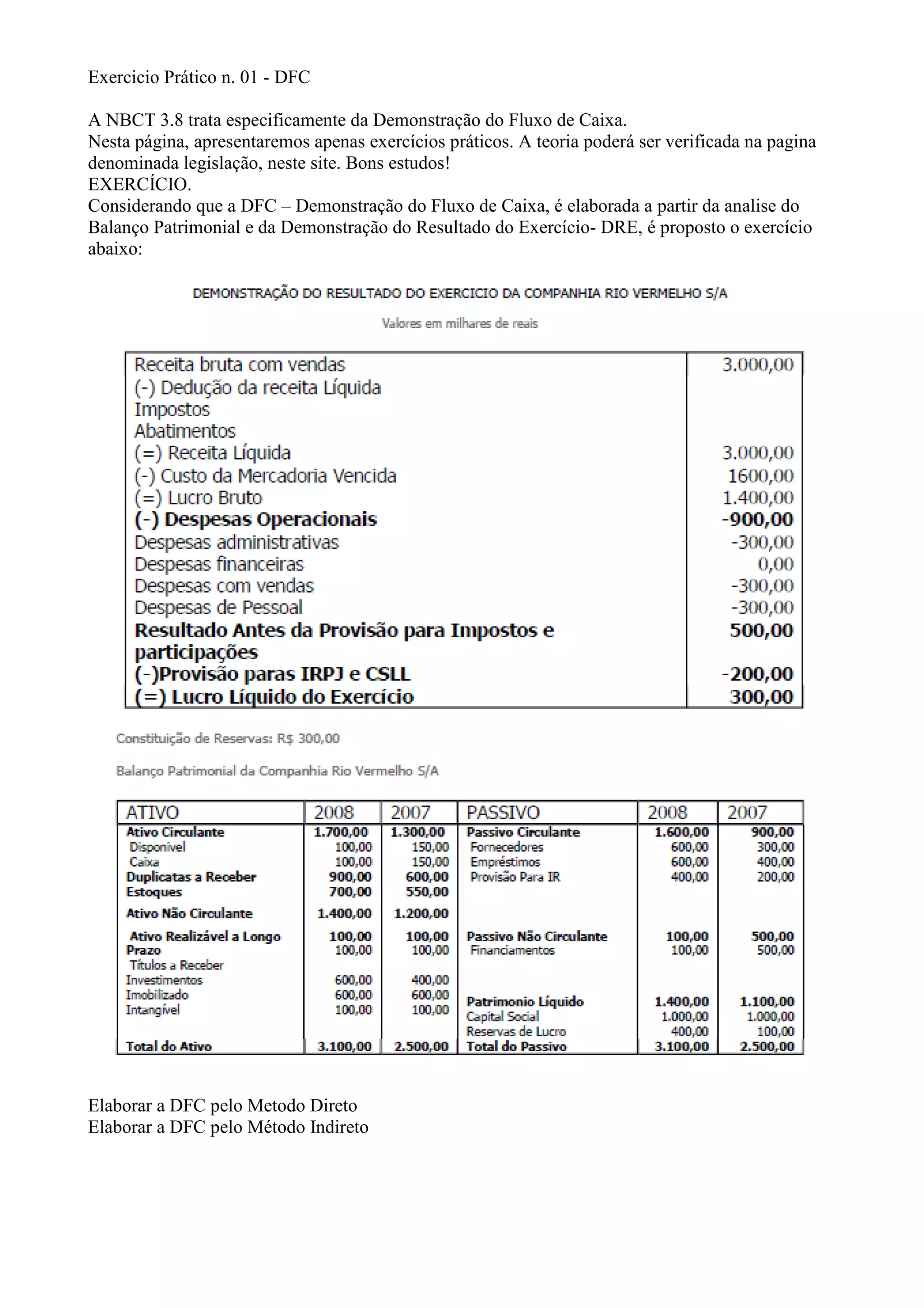 Este documento fornece instruções para elaborar a Demonstração do Fluxo de Caixa (DFC) de uma empresa fictícia chamada Vale do Rio Vermelho S/A para o exercício findo em 31/12/2008, utilizando o método indireto. Ele explica como calcular os valores de recebimentos de vendas, pagamentos a fornecedores e despesas operacionais com base nas informações contidas no Balanço Patrimonial e na Demonstração do Resultado do Exercício (DRE) da empresa. O documento conclui instruindo como