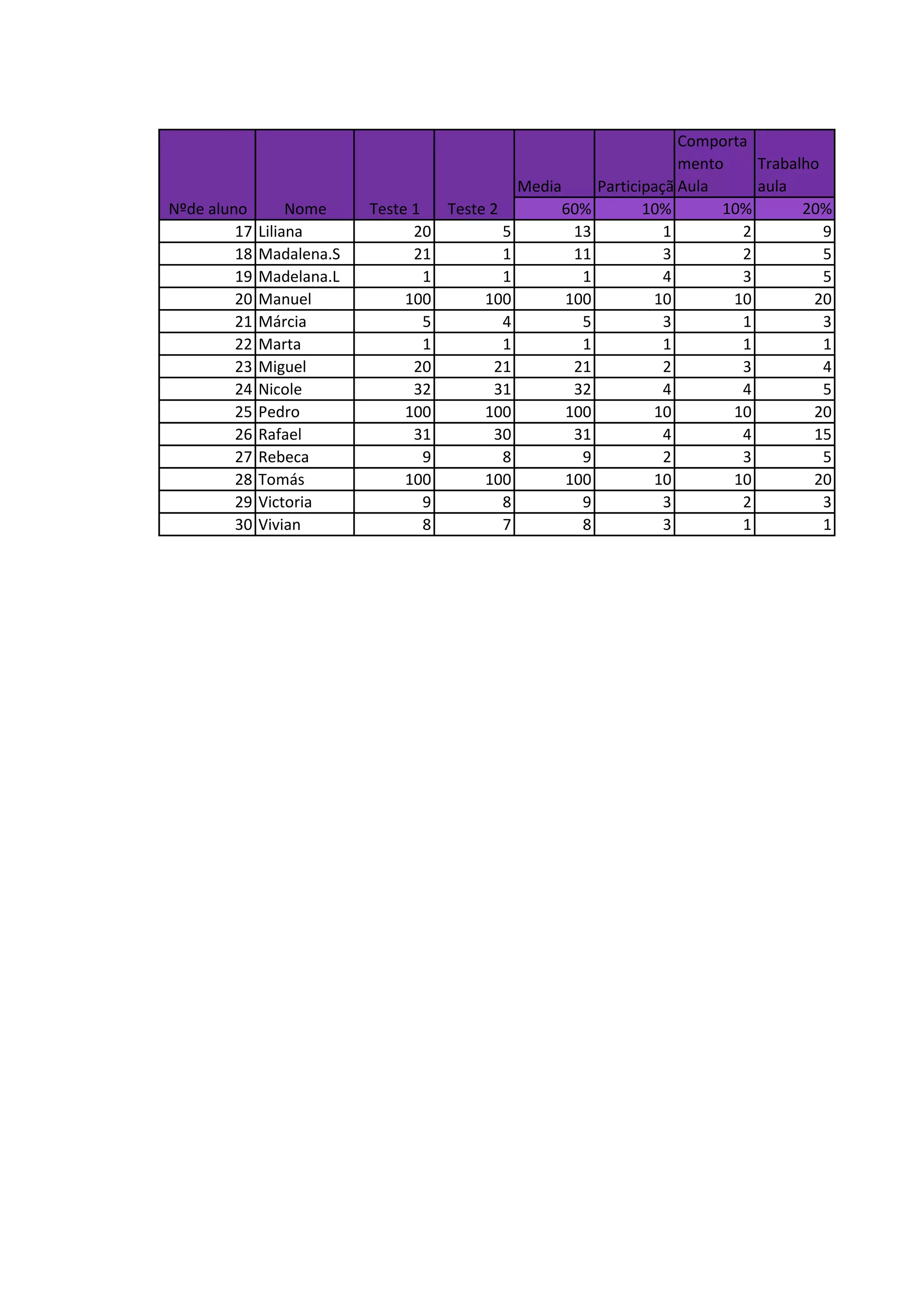 O documento apresenta dados sobre 14 alunos, incluindo seus nomes, notas nos testes 1 e 2, média, classificação de comportamento, trabalho, participação nas aulas e classificação final. As informações permitem comparar o desempenho acadêmico e comportamental dos estudantes.