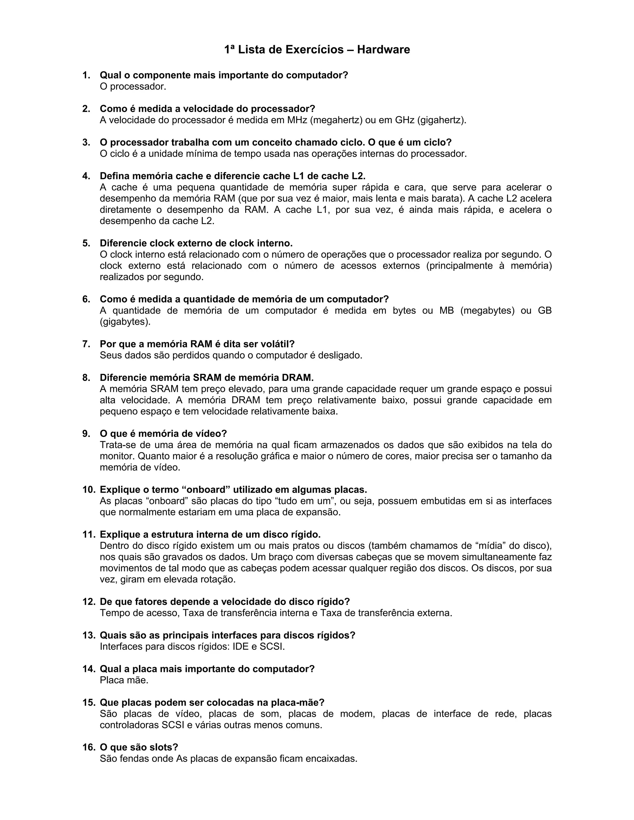 O documento discute os principais componentes de hardware de um computador, incluindo o processador, memória RAM e ROM, discos rígidos, placas de vídeo e interfaces. Ele explica como esses componentes funcionam e se comunicam para permitir que o computador execute tarefas.