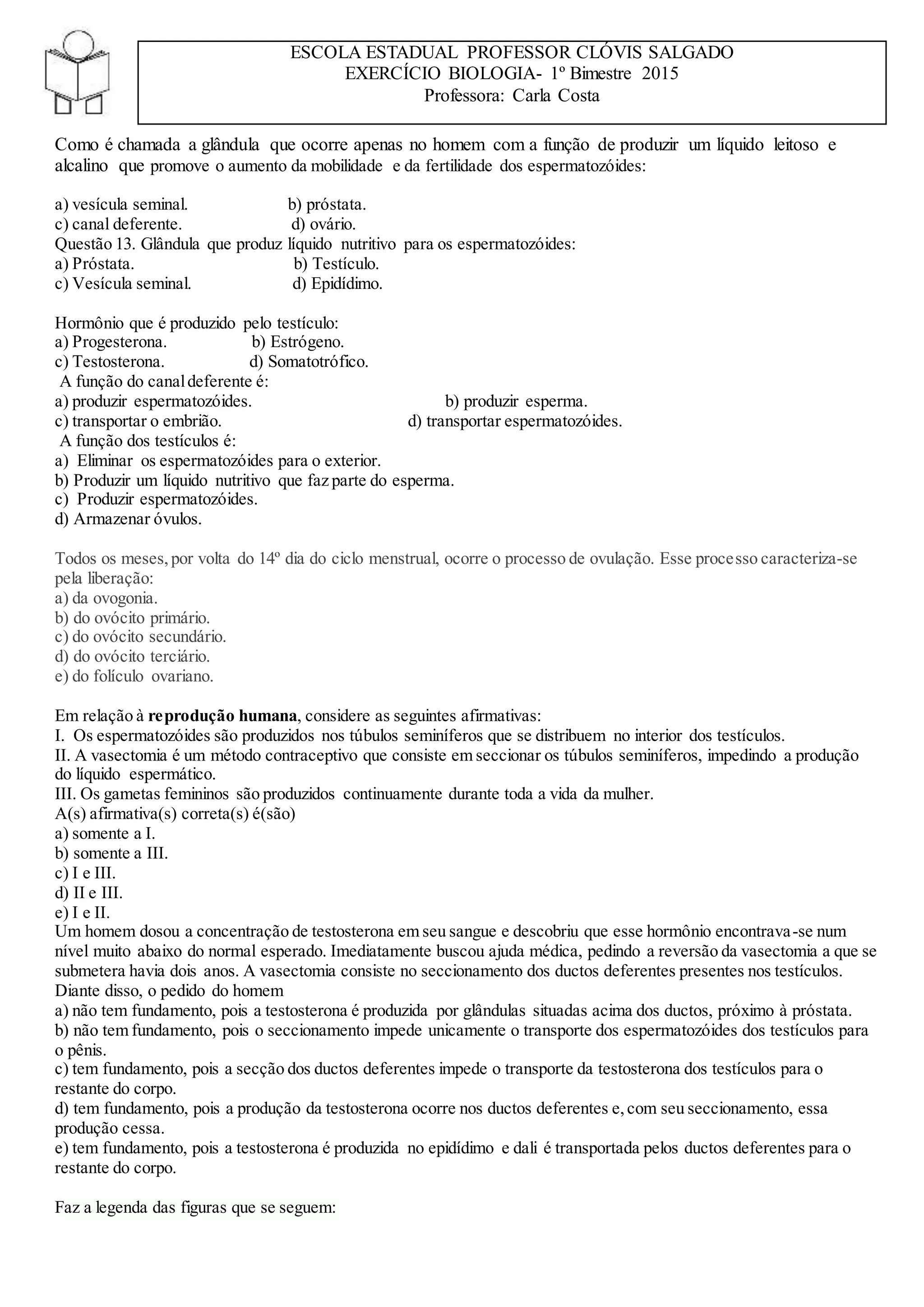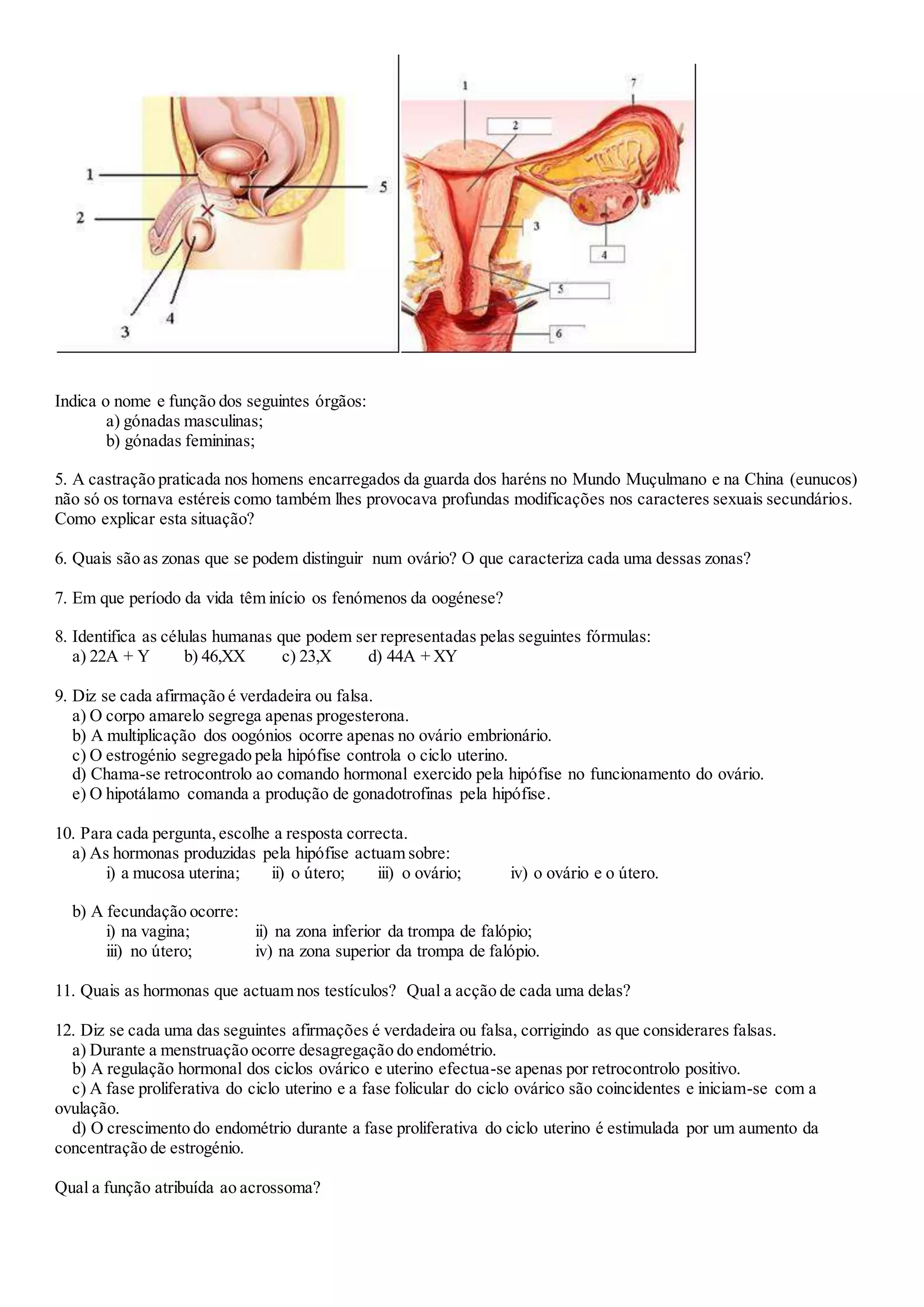 O documento fornece informações sobre a reprodução humana. Trata dos seguintes tópicos: 1) a próstata produz um líquido nutritivo para os espermatozóides; 2) a testosterona é produzida pelos testículos; 3) o canal deferente transporta espermatozóides; 4) a função dos testículos é produzir espermatozóides.