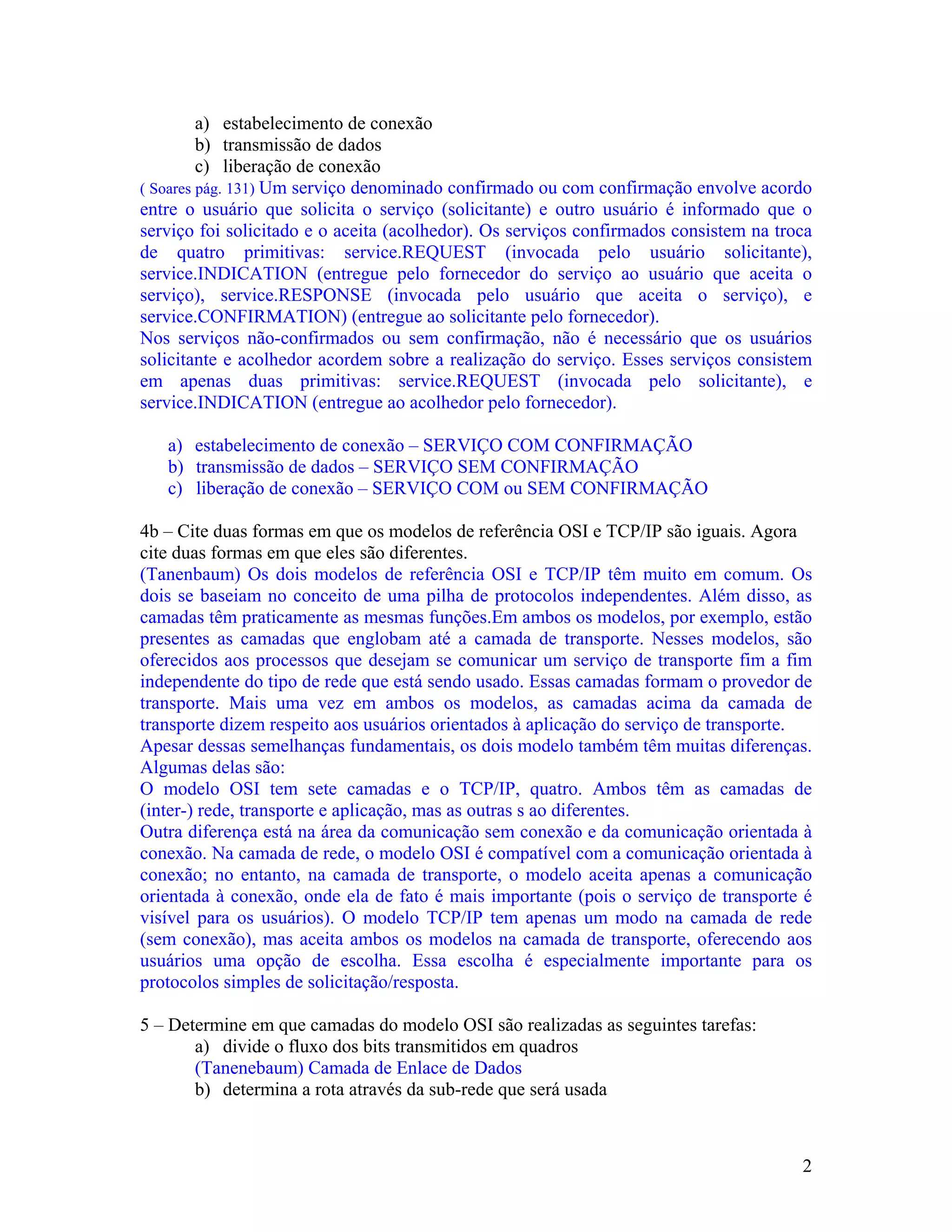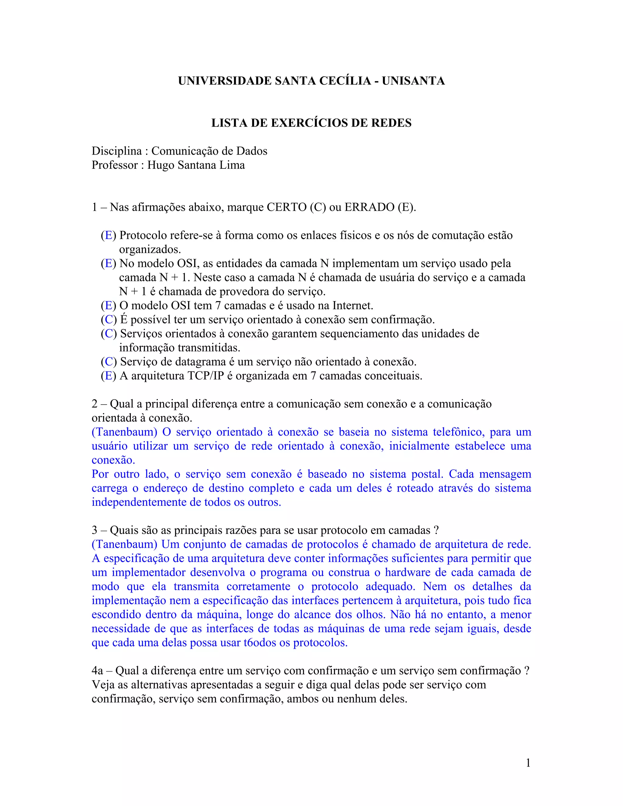(1) O documento apresenta uma lista de exercícios sobre redes de comunicação de dados com questões sobre protocolos, modelos OSI e TCP/IP, serviços com e sem confirmação, e funções das camadas dos modelos.