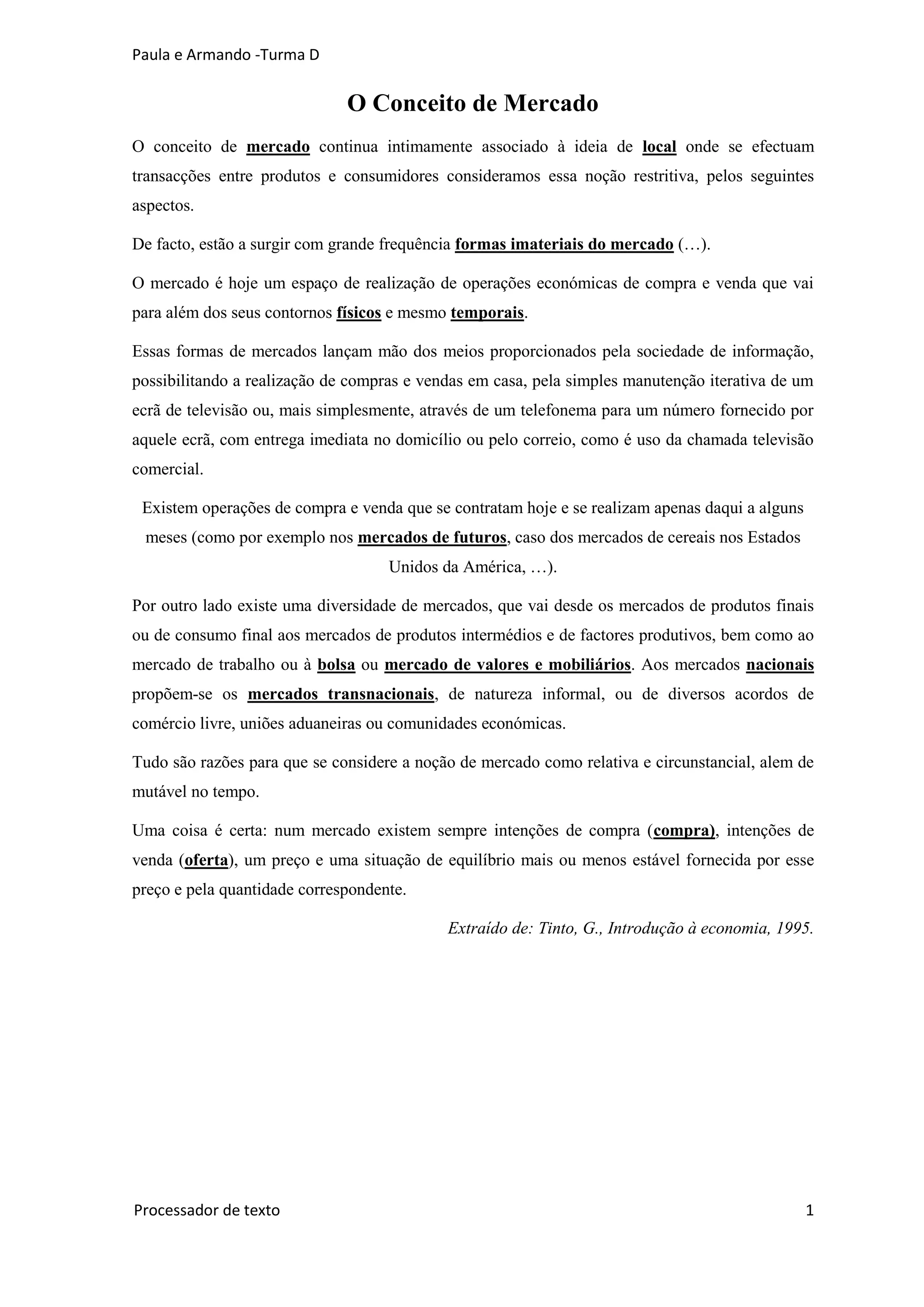 O documento discute como o conceito de mercado foi expandido para além de um local físico de transações. Agora, mercados podem ocorrer virtualmente através da internet e televisão, e operações podem ser contratadas meses antes de serem realizadas, como em mercados futuros. Existem também diversos tipos de mercados para diferentes produtos e fatores de produção em níveis local, nacional e internacional.