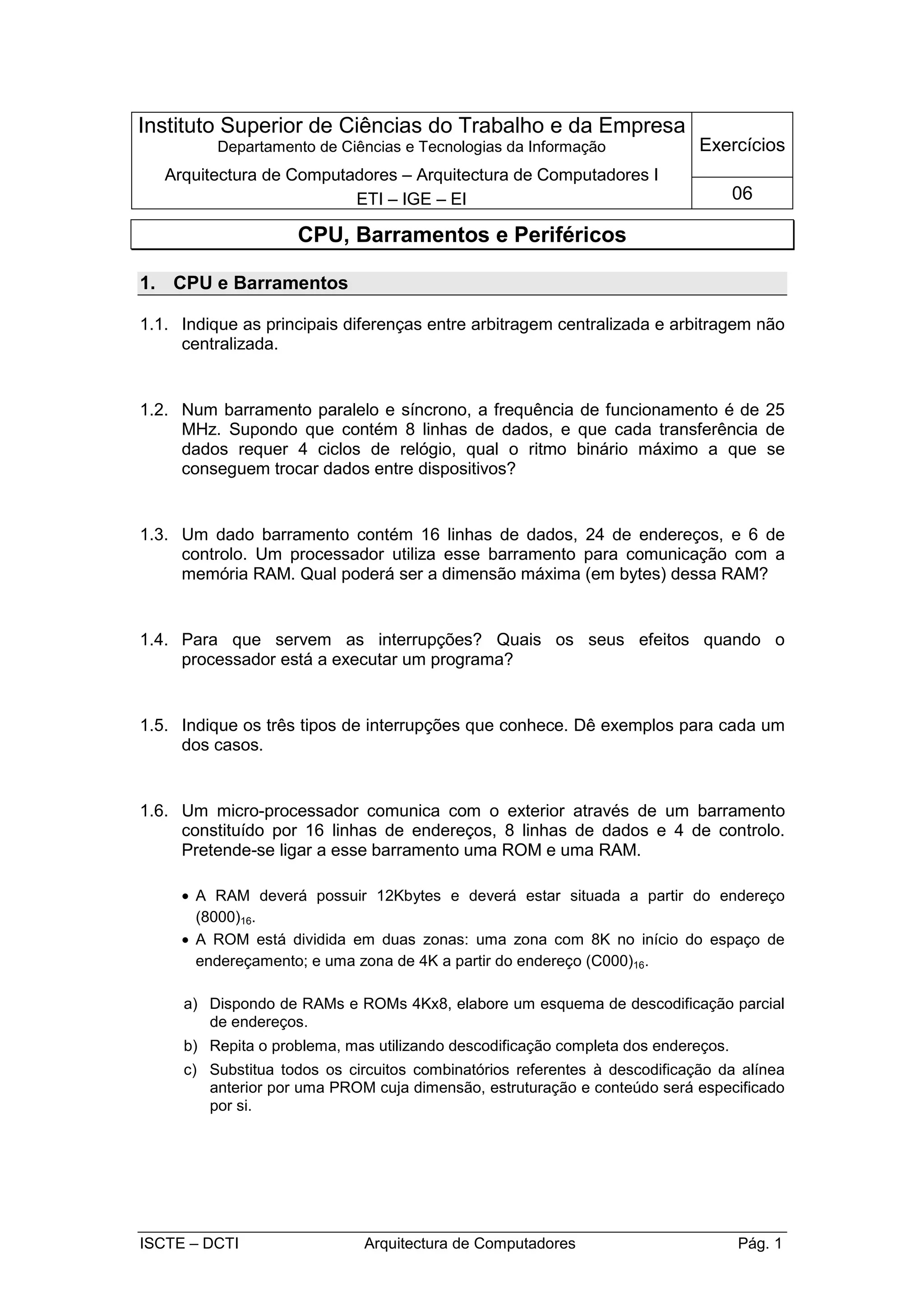Este documento apresenta uma série de exercícios sobre arquitetura de computadores, incluindo (1) diferenças entre arbitragem centralizada e não centralizada, capacidade máxima de RAM em relação a barramentos, e fetch de instruções; (2) projeto de circuitos como ALU e descodificação de endereços; (3) função de registos como program counter e stack pointer; e (4) cálculos sobre ritmos binários para vídeo e capacidade/velocidade de discos rígidos e CD-ROMs.
