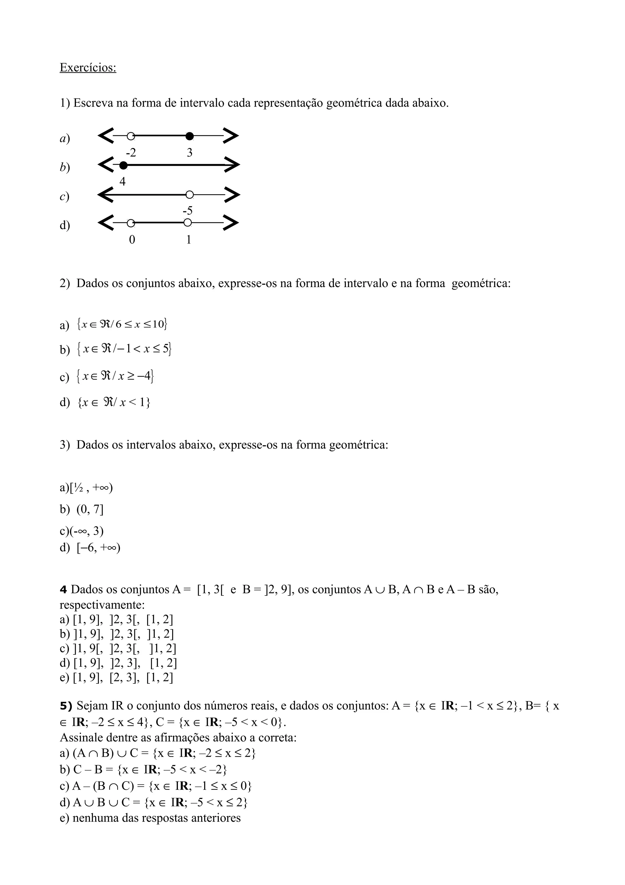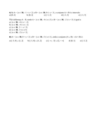 1) O documento apresenta 8 exercícios sobre operações com conjuntos numéricos expressos na forma de intervalos e geometricamente. Os exercícios pedem para expressar conjuntos numéricos na forma de intervalo e geometricamente, calcular união, interseção e diferença entre conjuntos, e identificar afirmações corretas sobre operações entre conjuntos.