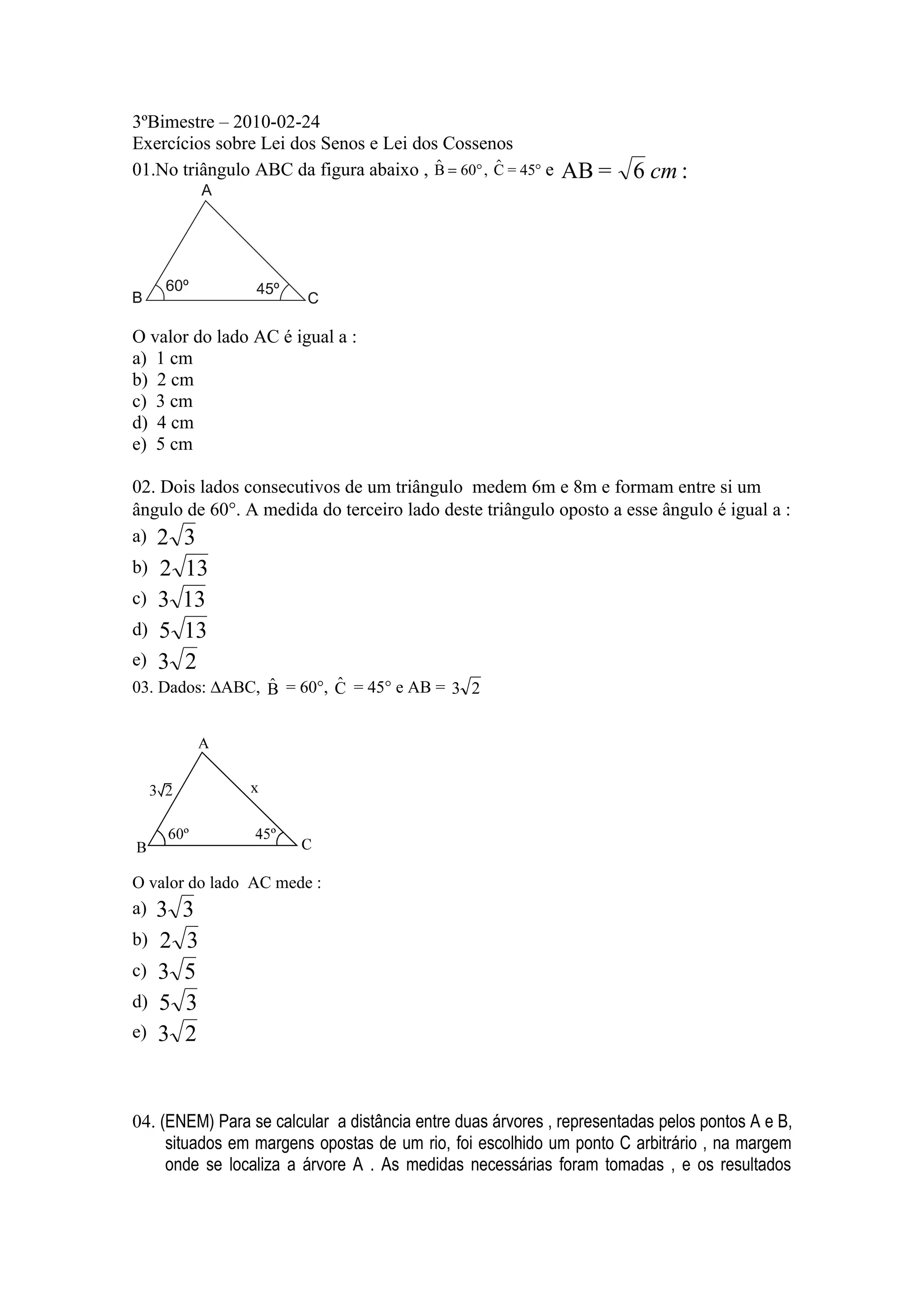 01.No triângulo ABC da figura abaixo , B = 60° , C = 45° e AB = 6 cm :