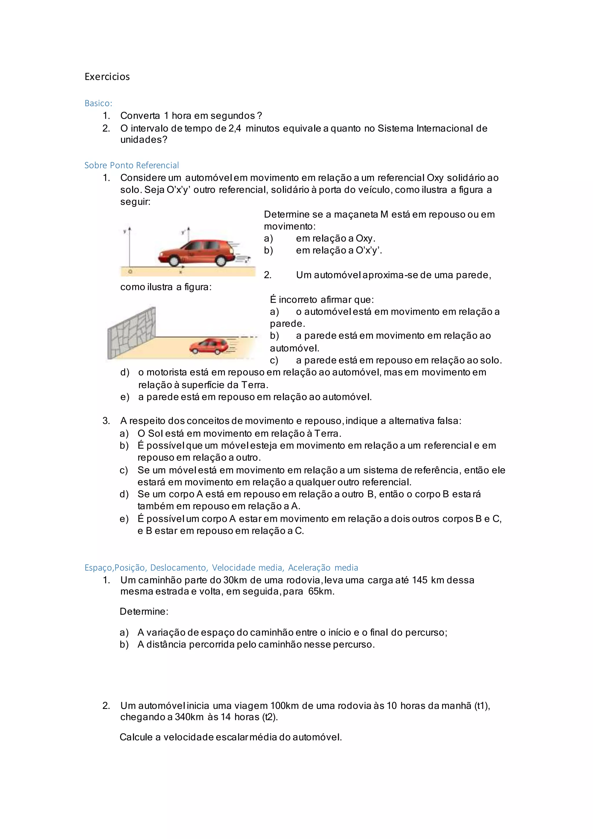 1. Considere um automóvel em movimento em relação a um referencial Oxy solidário ao