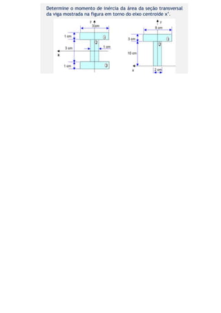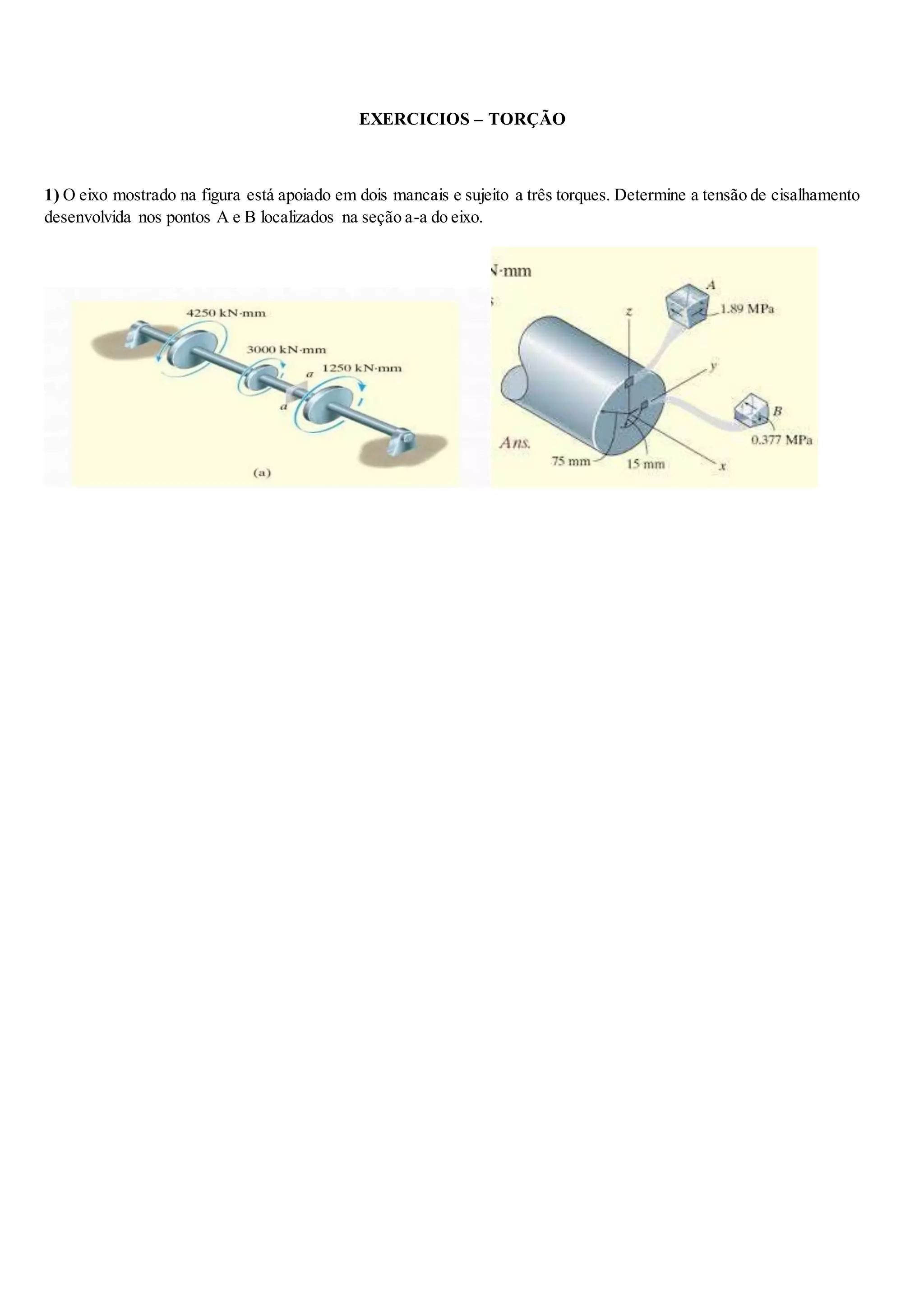 1) O documento apresenta exercícios sobre torção e flambagem de eixos, tubos, barras e vigas. Inclui determinar tensões de cisalhamento em seções sob torção e cargas axiais críticas de flambagem considerando fatores de segurança.