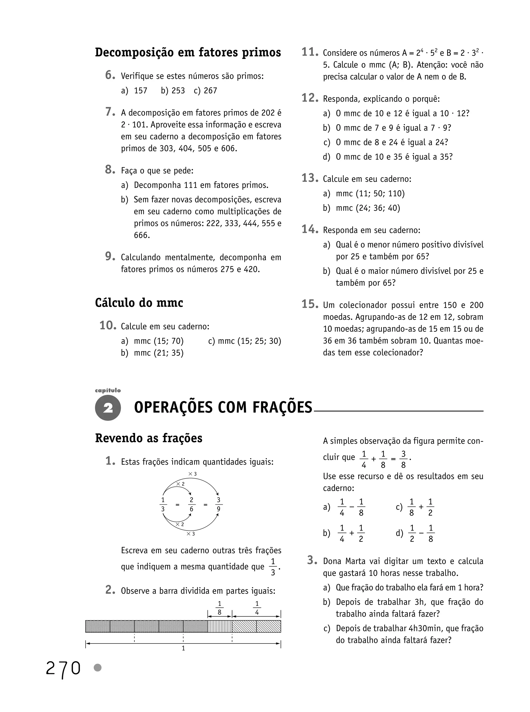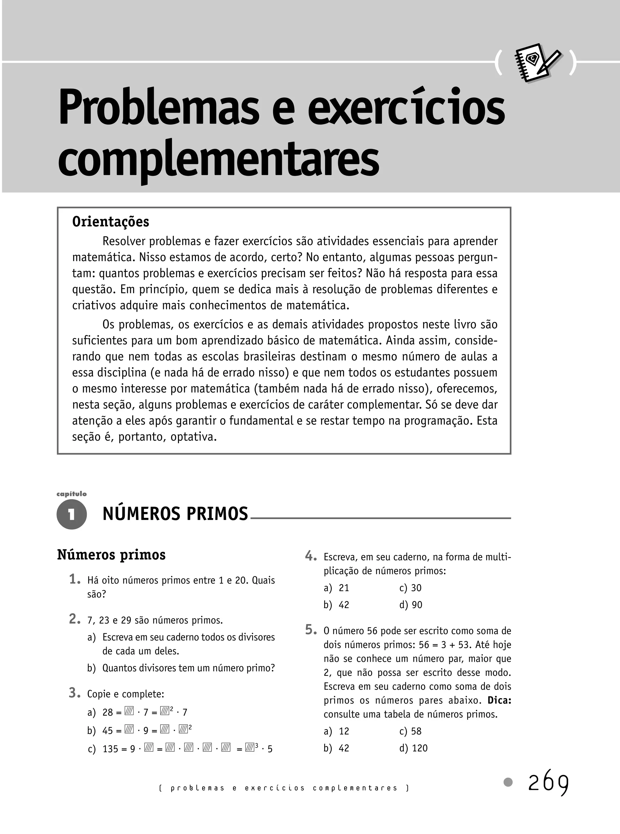 Este documento fornece problemas e exercícios complementares de matemática sobre números primos, operações com frações e cálculo do mínimo múltiplo comum (mmc). Inclui 15 exercícios sobre números primos, 9 exercícios sobre operações com frações e 15 exercícios sobre cálculo do mmc.