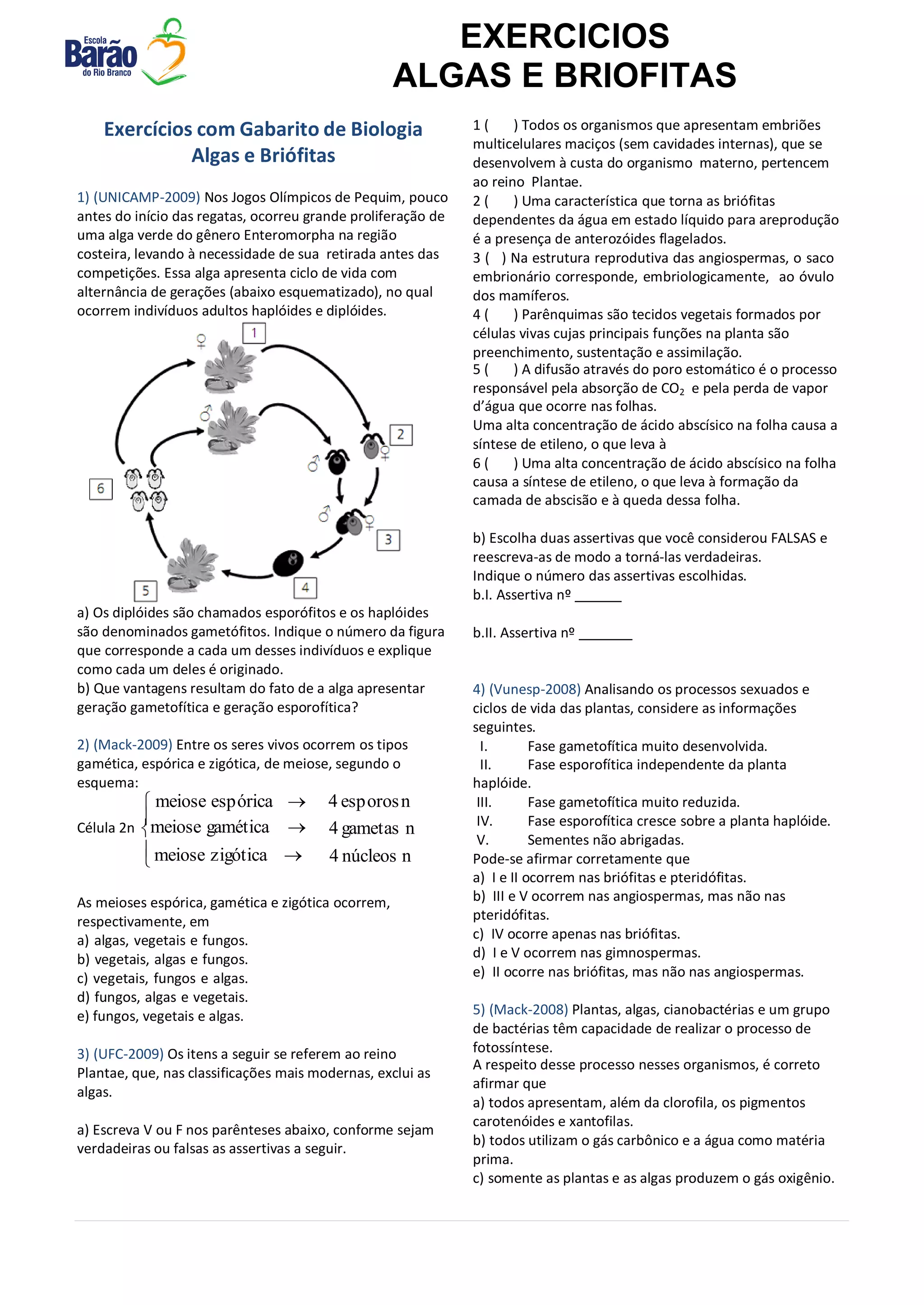 1) O documento apresenta exercícios sobre algas e briófitas com perguntas e alternativas de respostas. 2) As perguntas abordam tópicos como ciclo de vida de algas, características de briófitas e pteridófitas, classificação de grupos vegetais e processos como fotossíntese. 3) Há também perguntas sobre densidade demográfica de plantas encontradas em uma área demarcada e características de liquens.