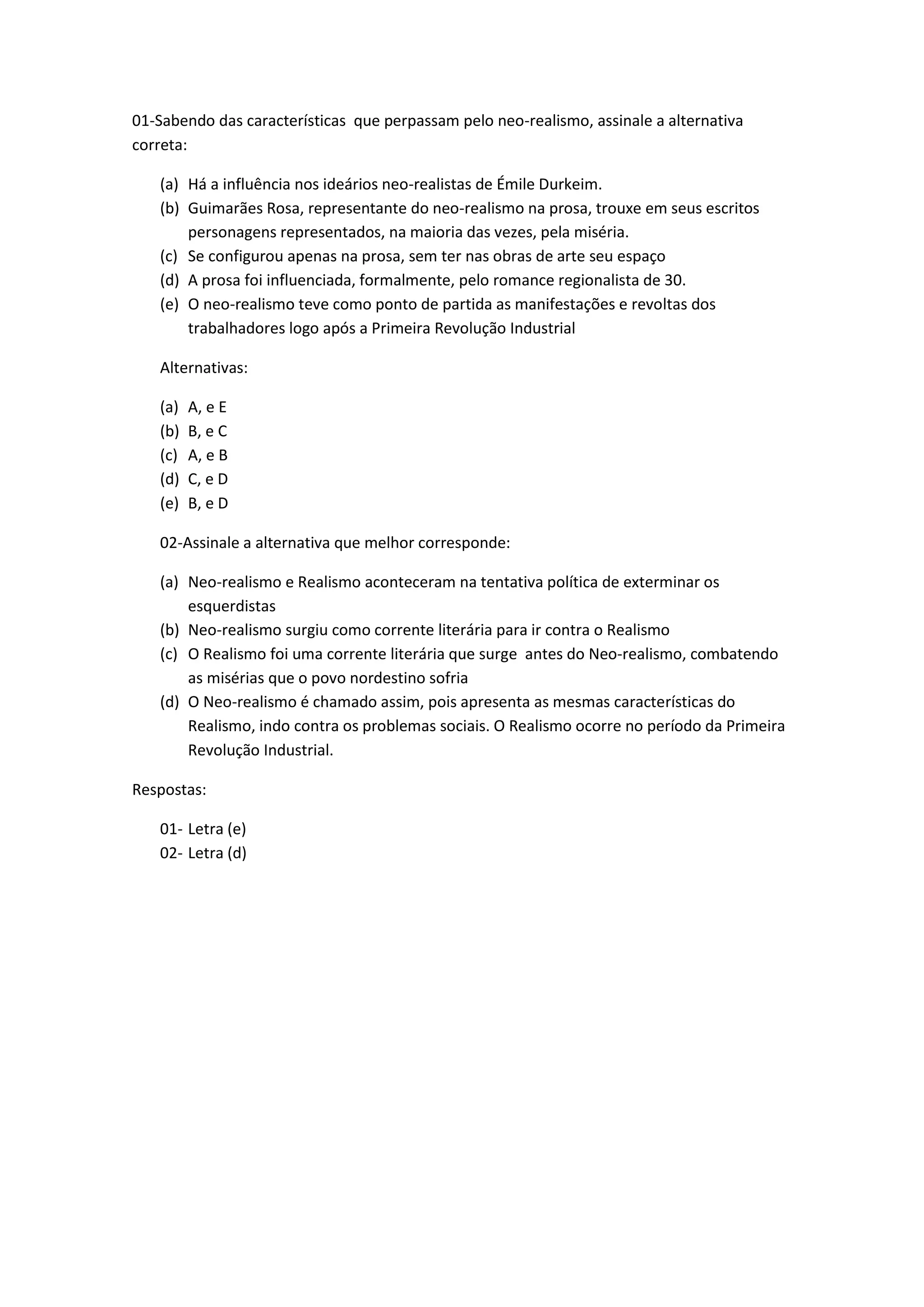 O documento discute as características do neo-realismo na literatura brasileira. Ele afirma que o neo-realismo (1) foi influenciado pelas manifestações dos trabalhadores após a Primeira Revolução Industrial e (2) retratou personagens representados pela miséria, como nas obras de Guimarães Rosa. O neo-realismo também (3) apresenta as mesmas características do realismo ao combater os problemas sociais, movimento que ocorreu durante a Primeira Revolução Industrial.