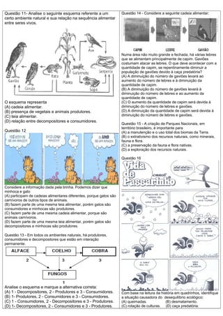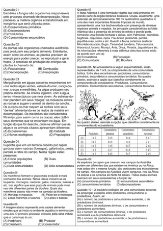 2) As questões examinam os papéis de produtores, consumidores e decompositores em diferentes ecossistemas, incluindo a Mata Atlântica.