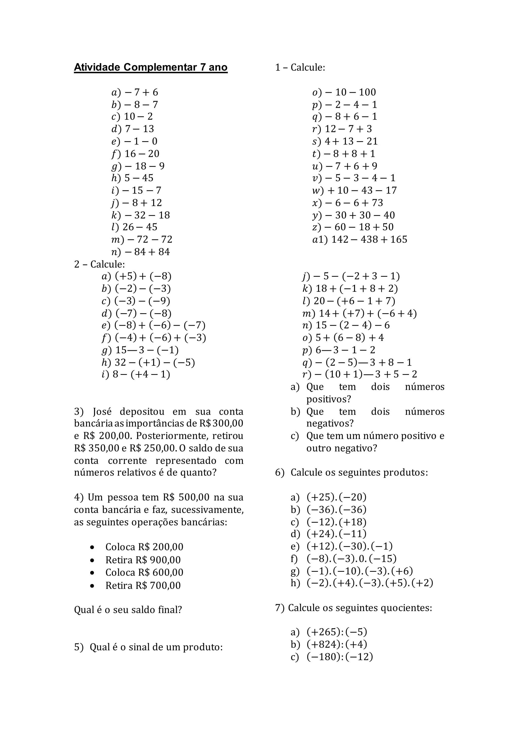 O documento contém uma série de exercícios matemáticos envolvendo operações com números inteiros e racionais, incluindo adição, subtração, multiplicação, divisão e resolução de problemas. Os exercícios abordam cálculos com números positivos e negativos, operações bancárias, produtos e quocientes numéricos.