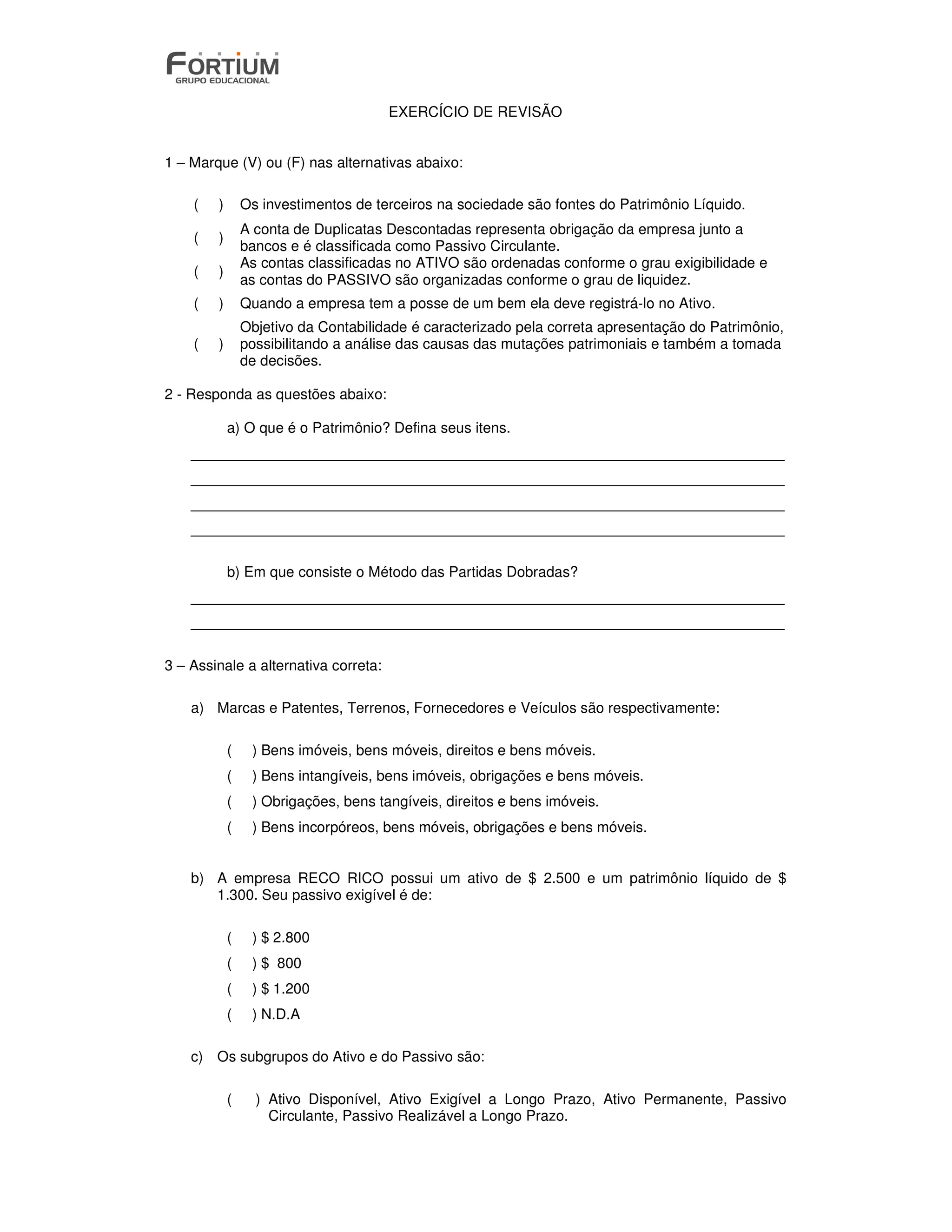 O documento contém um exercício de revisão contábil com questões sobre patrimônio líquido, método das partidas dobradas, classificação de contas no balanço patrimonial e lançamentos contábeis. O resumo abrange os principais pontos tratados no exercício, como a definição de patrimônio líquido, os subgrupos de ativo e passivo, e os lançamentos para a abertura de uma empresa de varejo.