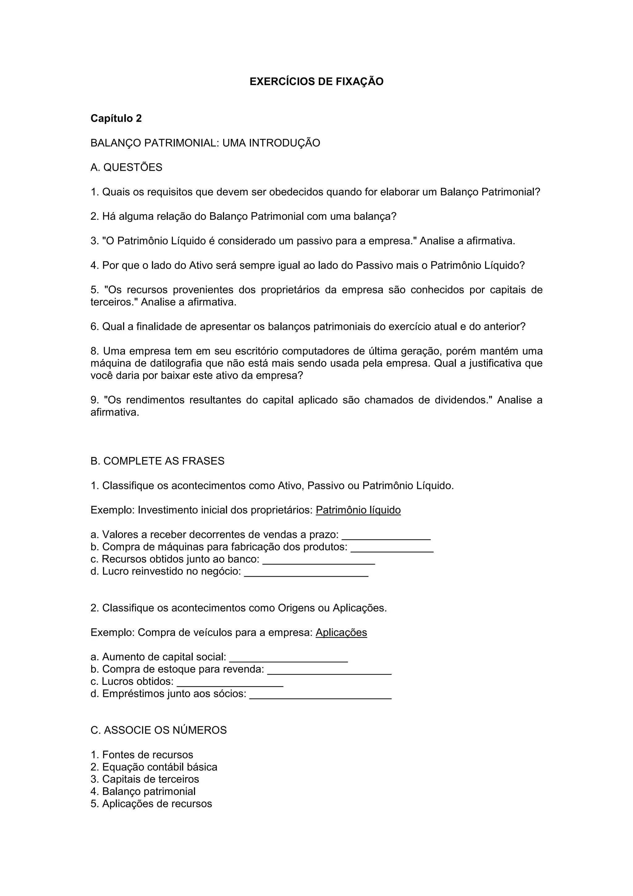 Este documento apresenta questões e exercícios sobre o Balanço Patrimonial, incluindo: 1) os requisitos para elaborar um Balanço Patrimonial; 2) a relação entre o Balanço Patrimonial e uma balança; 3) a classificação de itens como Ativo, Passivo ou Patrimônio Líquido. Além disso, pede para estruturar o Balanço Patrimonial de uma empresa e corrigir um Balanço Patrimonial apresentado de forma incorreta.