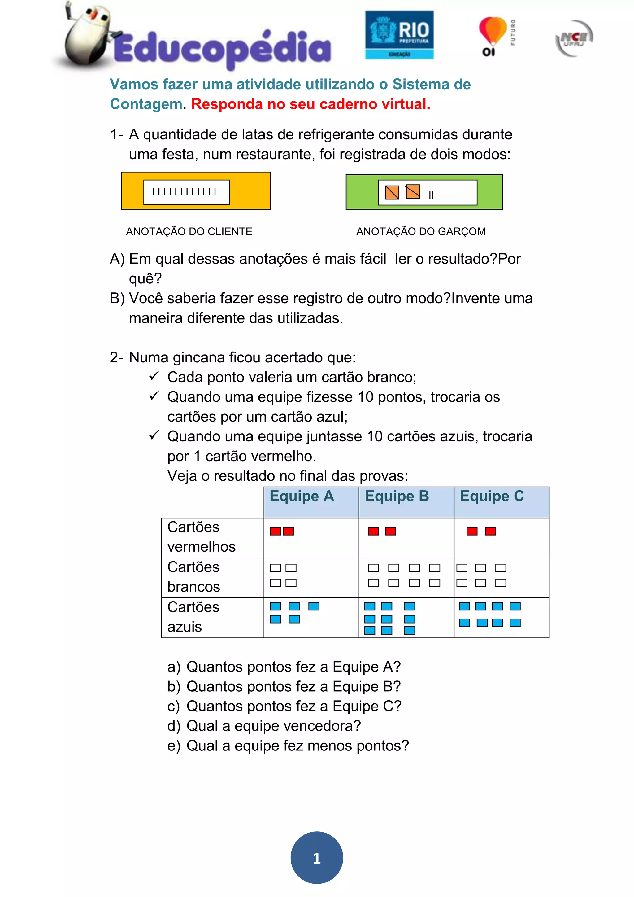 O documento descreve duas formas de registrar o número de latas de refrigerante consumidas em uma festa e pede para identificar qual é mais fácil de ler. Também apresenta as regras de uma gincana e pede para calcular os pontos de cada equipe e identificar a vencedora e a que fez menos pontos.