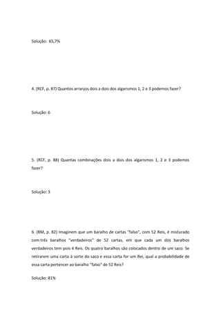 Este documento fornece exemplos de exercícios de probabilidade e métodos de contagem de um livro didático de Estatística I. Inclui soluções detalhadas para 6 exercícios e notas sobre quais capítulos de 3 livros didáticos contêm exercícios relevantes para a matéria cobriada.