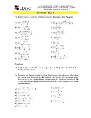 1) Determinar os seguintes limites com auxílio das regras de L’Hospital.