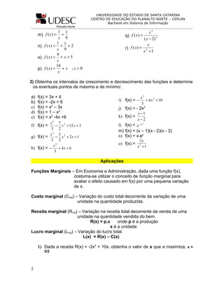 Este documento fornece exercícios sobre limites, funções, gráficos de funções, maximização de lucro, custo marginal e receita marginal. Inclui 15 exercícios sobre aplicações de funções marginais em economia e administração.