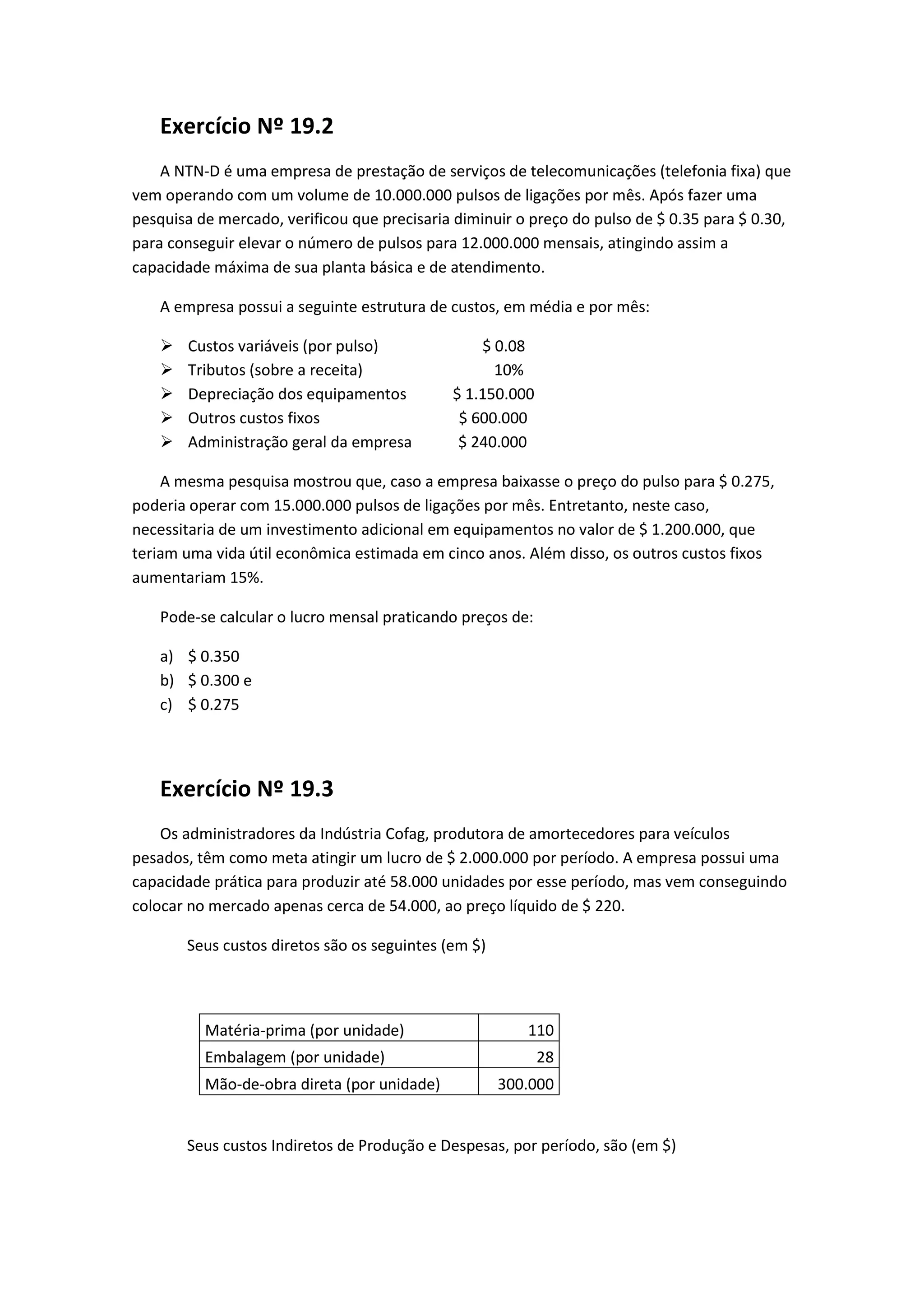 A empresa de telecom NTN-D opera com 10 milhões de pulsos por mês a R$0,35 cada e precisa aumentar para 12 milhões para atingir sua capacidade máxima. Reduzindo o preço para R$0,30, poderia alcançar essa meta. Ao reduzir para R$0,275, poderia operar com 15 milhões de pulsos mas precisaria investir R$1,2 milhão em equipamentos.