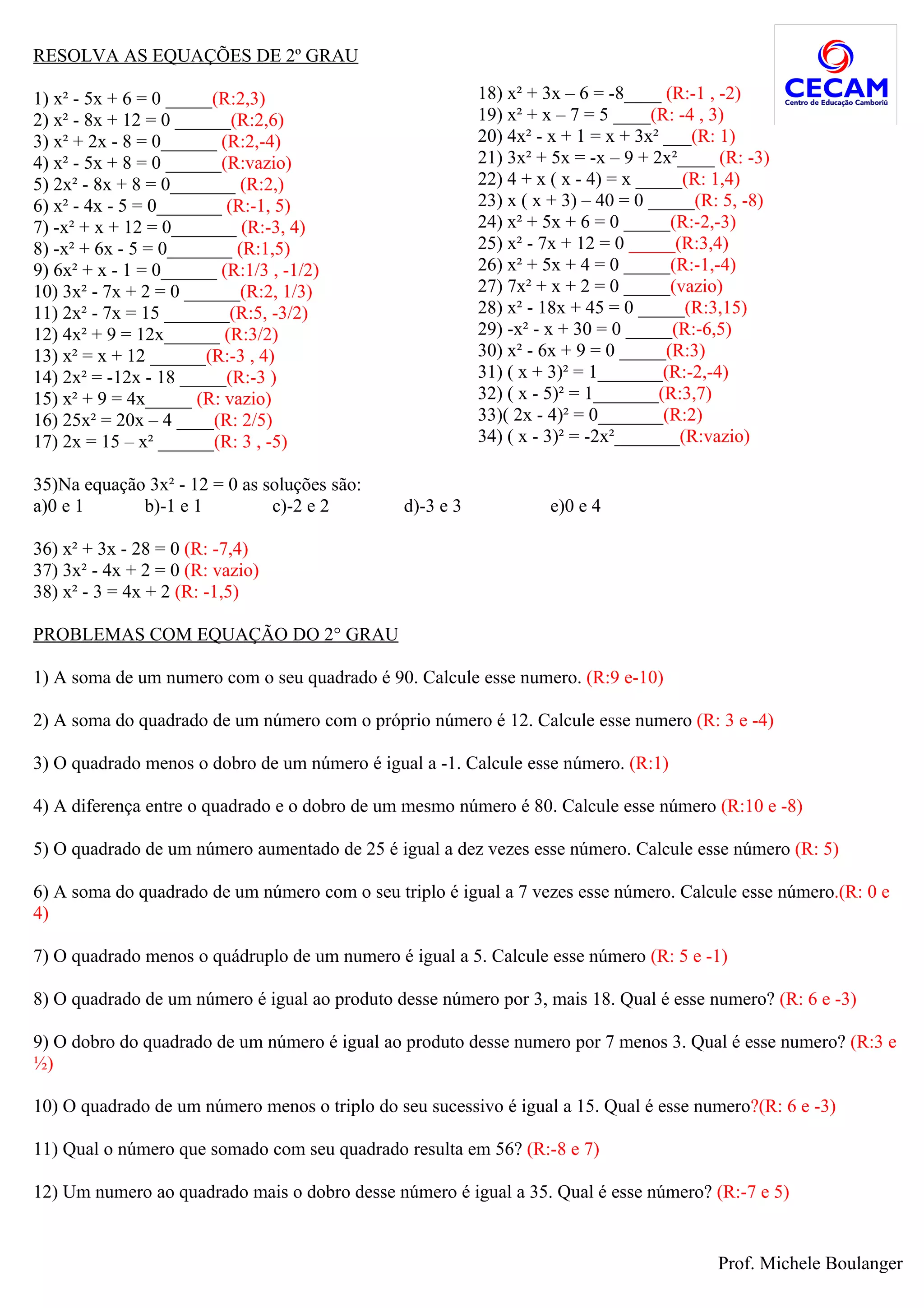 2) A soma do quadrado de um número com o próprio número é 12. Calcule esse numero (R: 3 e -4)