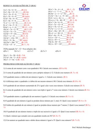 O documento apresenta uma lista de exercícios de equações de 2o grau, incluindo resolução de equações, identificação de raízes e problemas envolvendo equações do 2o grau.