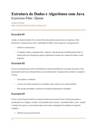 1. O documento apresenta 4 exercícios sobre filas (queues) em Java.