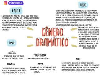 O documento discute o gênero dramático na produção de textos, enfatizando sua definição, estrutura e características essenciais. O texto também analisa a criação e a representação teatral, considerando elementos como personagens, ação dramática, ambiente e tema. Além disso, apresenta questões sobre a classificação de gêneros literários, exemplificando com obras de diversos autores.