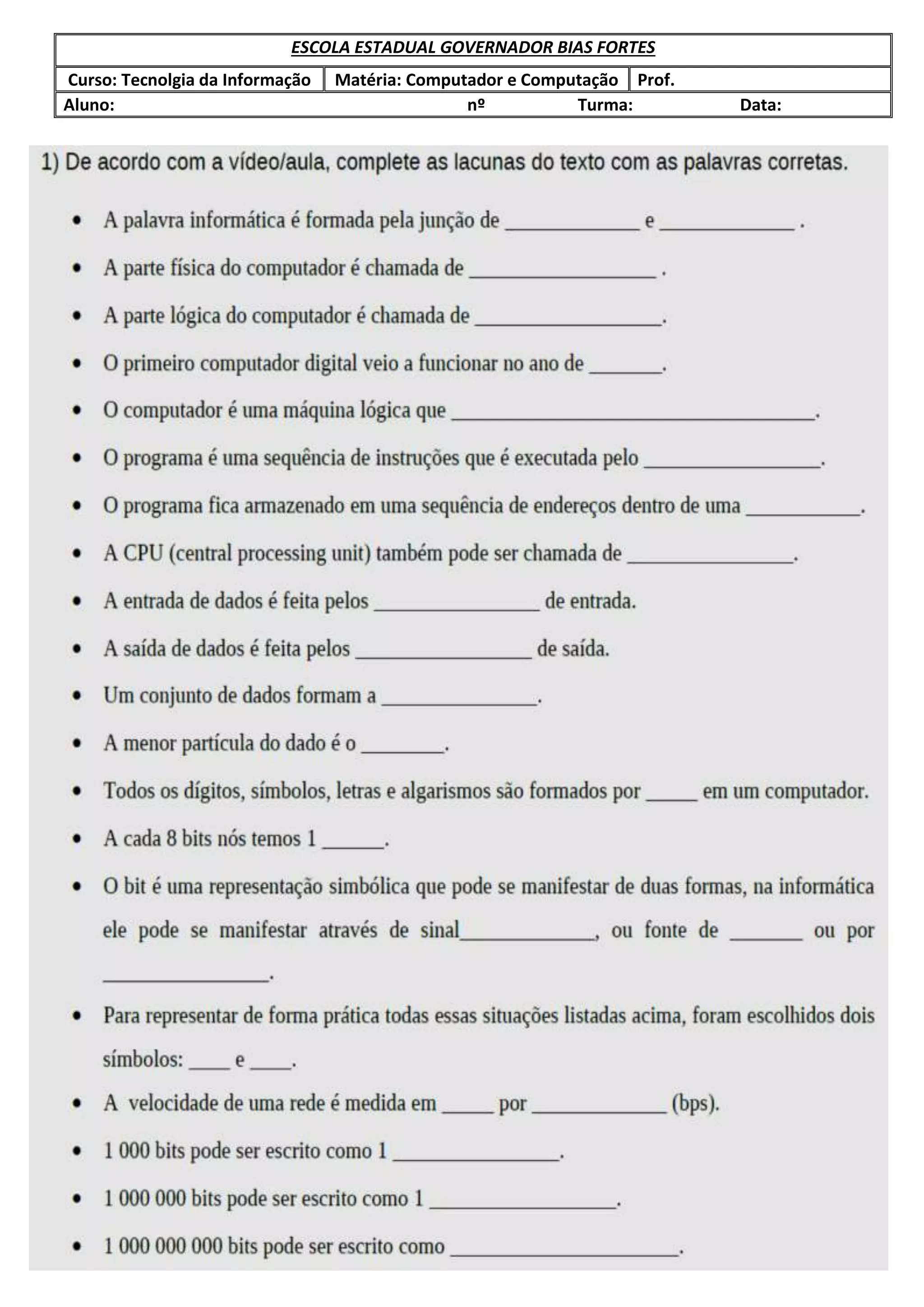 Este documento é um registro de aula de Tecnologia da Informação em uma escola estadual. A aula abordou o tema de Computador e Computação e foi ministrada por um professor para um aluno em determinada turma e data.