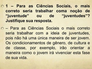 O documento discute diversos aspectos relacionados à juventude segundo as Ciências Sociais. Aborda temas como a noção de "juventudes" ao invés de "juventude", os condicionamentos sociais que influenciam a vivência dos jovens e o papel dos meios de comunicação na construção de estereótipos sobre a juventude.
