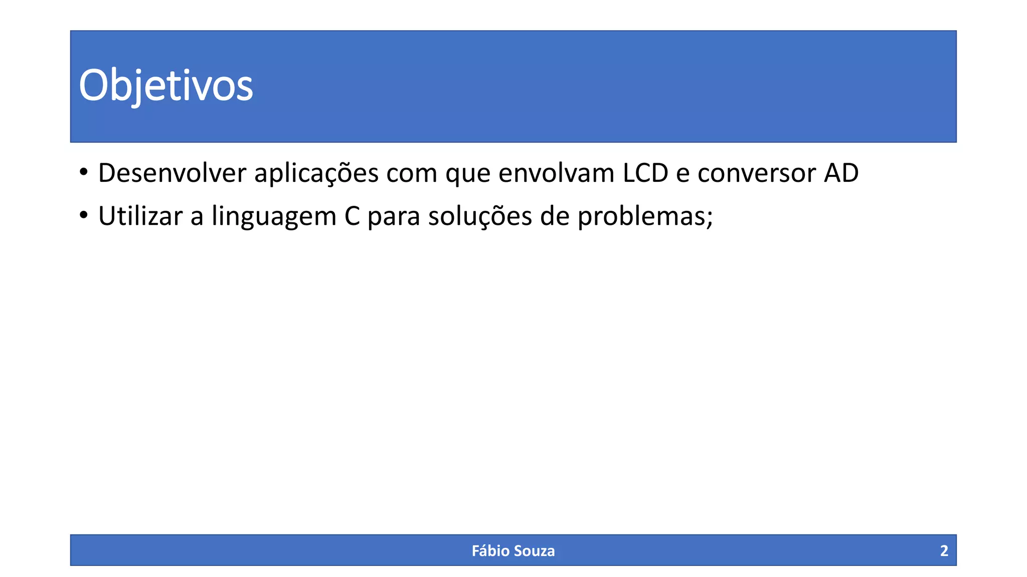 O documento apresenta 6 exercícios para desenvolver aplicações utilizando LCD e conversor AD em microcontroladores PIC que incluem: 1) desenvolver um relógio digital; 2) contador de eventos de 0 a 9999; 3) ajustar um valor de 0 a 100 usando teclas; 4) cronômetro decrescente de minutos e segundos; 5) multímetro digital para ler tensão de 0 a 35V; 6) exibir temperatura de sensor LM35.