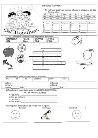 O documento apresenta exercícios sobre o alfabeto em inglês. Nele, os alunos devem: 1) associar os sons do alfabeto a cada letra; 2) completar uma cruzadinha com palavras do quadro; 3) completar frases com palavras do quadro.