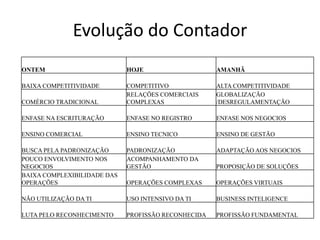 O documento descreve a evolução da profissão do contador, comparando o passado, presente e futuro. No passado, os contadores tinham baixa competitividade, se concentravam na escrituração e tinham pouca participação nos negócios. No presente, eles são mais competitivos, acompanham a gestão de operações complexas e usam intensivamente a tecnologia. No futuro, serão fundamentais para propor soluções globais e virtuais, com foco nos negócios e business intelligence.