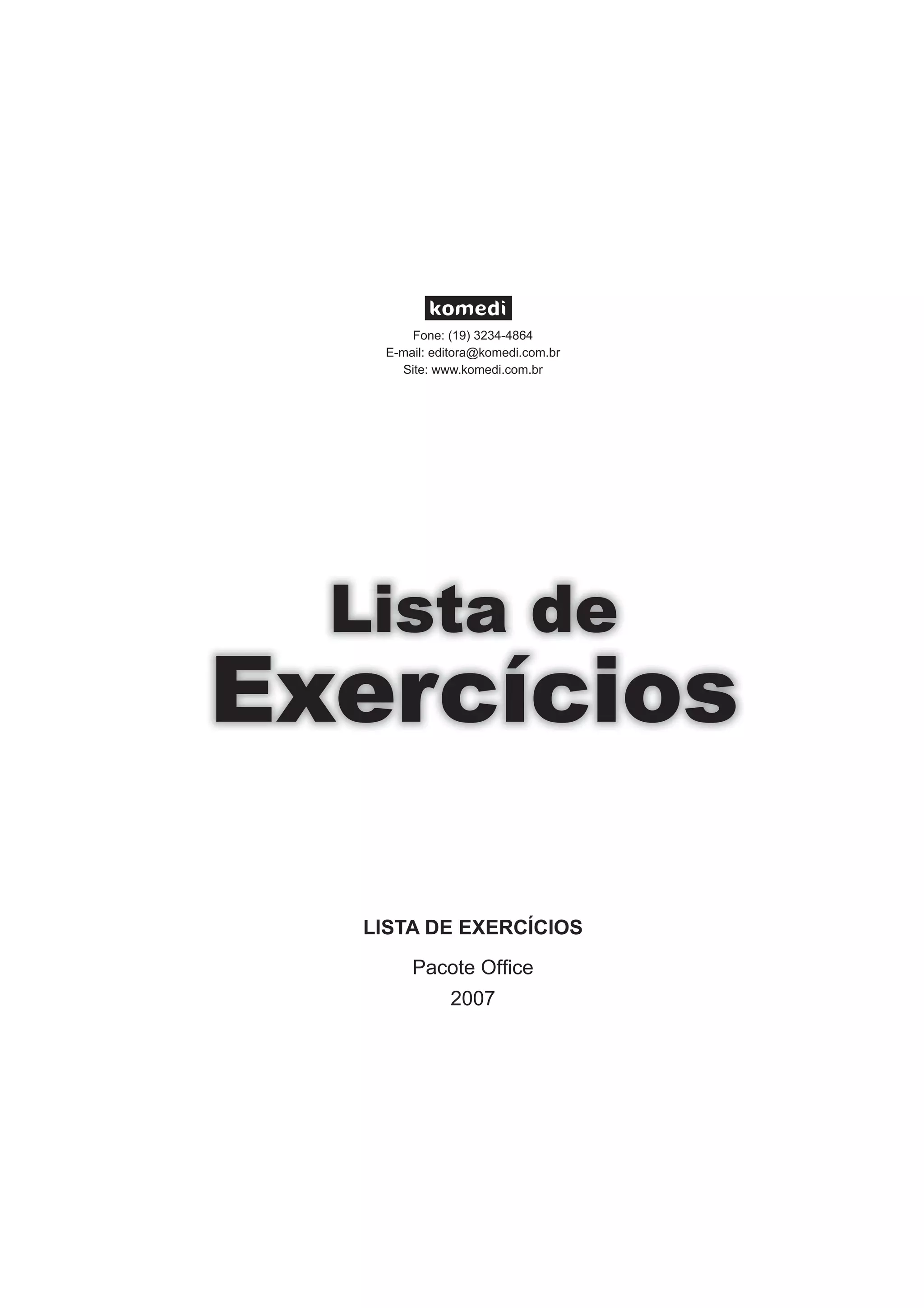 Este documento apresenta uma lista de exercícios para o pacote Office 2007, incluindo Microsoft Word, Excel, PowerPoint e Access. A lista contém exercícios de nível básico, intermediário e avançado para cada aplicativo, cobrindo tópicos como formatação, tabelas, figuras e impressão.