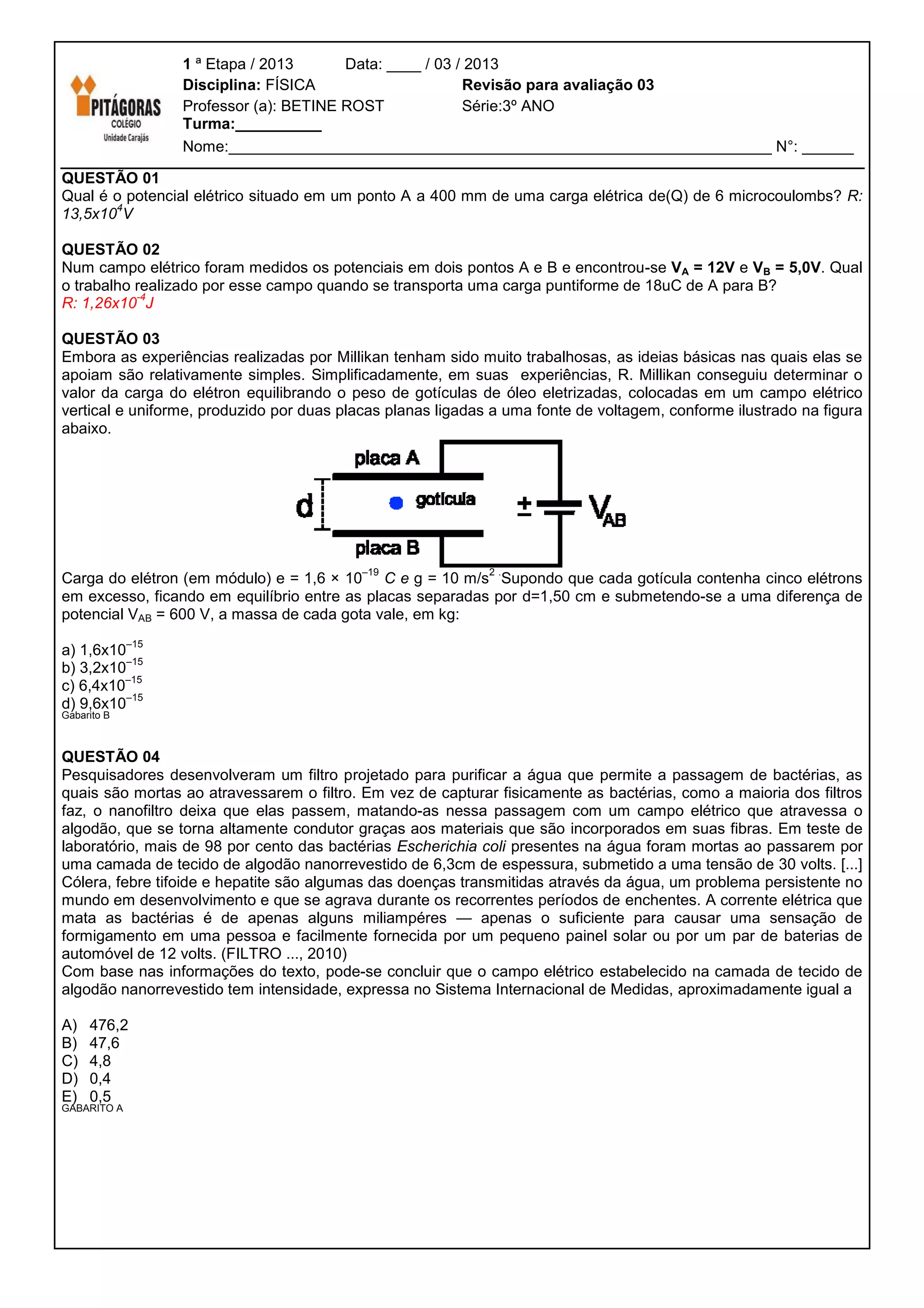 Este documento contém 11 questões sobre conceitos de eletrostática e campo elétrico, incluindo cálculos de potencial elétrico, intensidade de campo elétrico, trabalho realizado por forças elétricas e energia potencial elétrica. As questões abordam tópicos como a lei de Coulomb, campo elétrico gerado por cargas pontuais e placas carregadas, e aplicações como o filtro de água que mata bactérias com campo elétrico e o potencial de membrana de células.