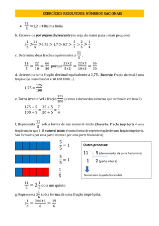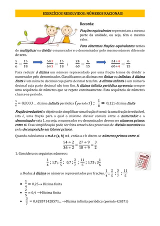 O documento apresenta conceitos sobre números racionais como frações equivalentes, redução de frações para decimais finitas e infinitas periódicas, e simplificação de frações. Exemplos resolvidos ilustram como reduzir frações para decimais, ordená-las, encontrar frações equivalentes, tornar frações irredutíveis e representar frações como numerais mistos.