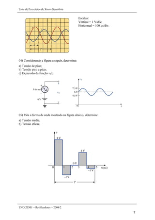 Este documento apresenta uma lista de 45 exercícios relacionados a sinais senoidais, incluindo determinação de parâmetros de formas de onda, conversão entre ângulos e radianos, cálculo de reatâncias em indutores e capacitores, e operações com números complexos. As questões envolvem análise de sinais senoidais em osciloscópios, cálculo de período, frequência, valor de pico, entre outros parâmetros.