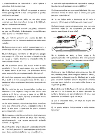 Este documento contém 20 problemas que envolvem cálculos de velocidade média e conversão entre unidades de velocidade como km/h e m/s. Os problemas abordam cenários como deslocamento de veículos, atletas e migração de pássaros, fornecendo dados como distância, tempo e velocidade para que se calcule a velocidade média.